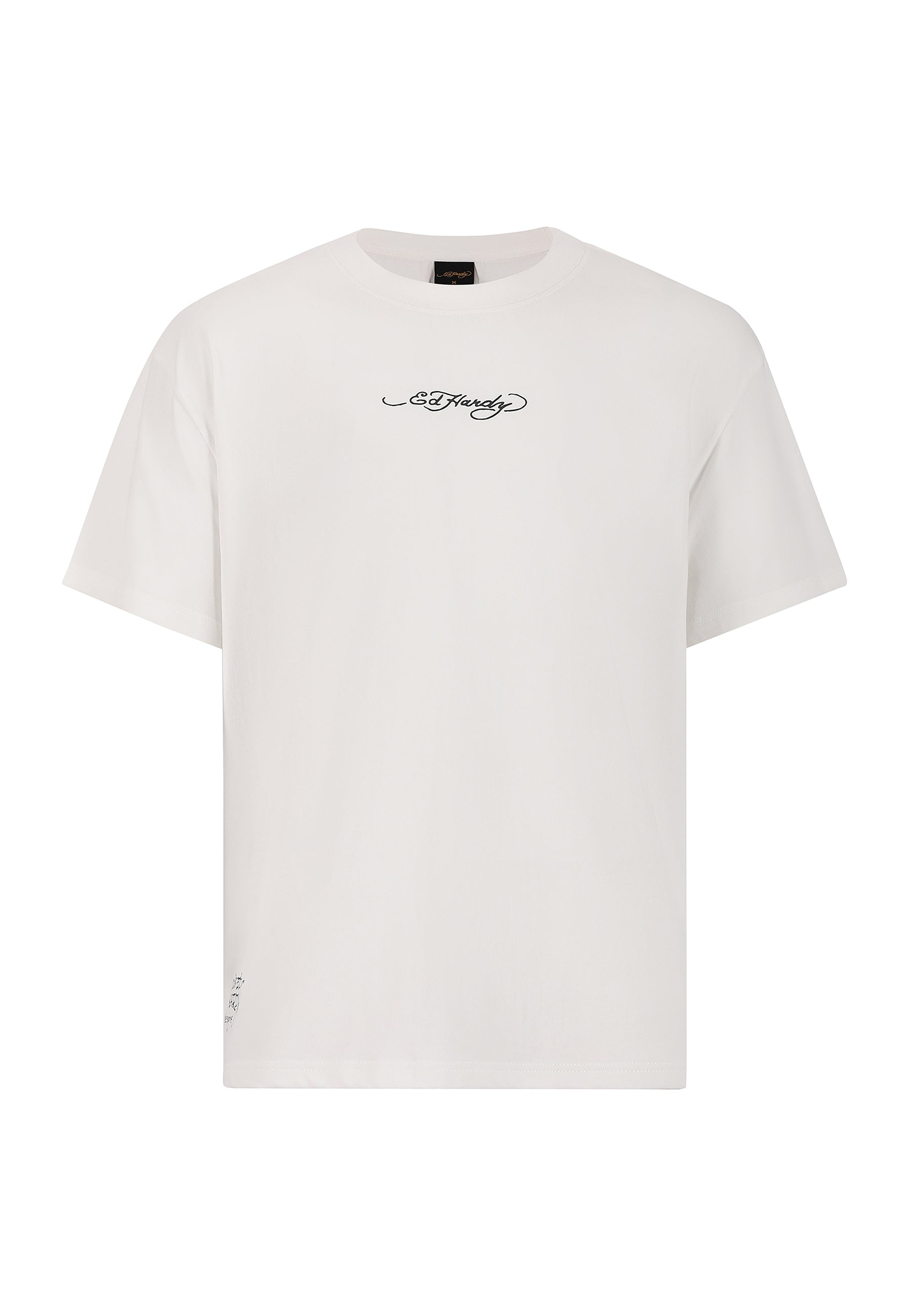 Relaxed fit with short sleeves Soft 100% white cotton Ribbed collar detail Ed Hardy chest logo Large graphic back print