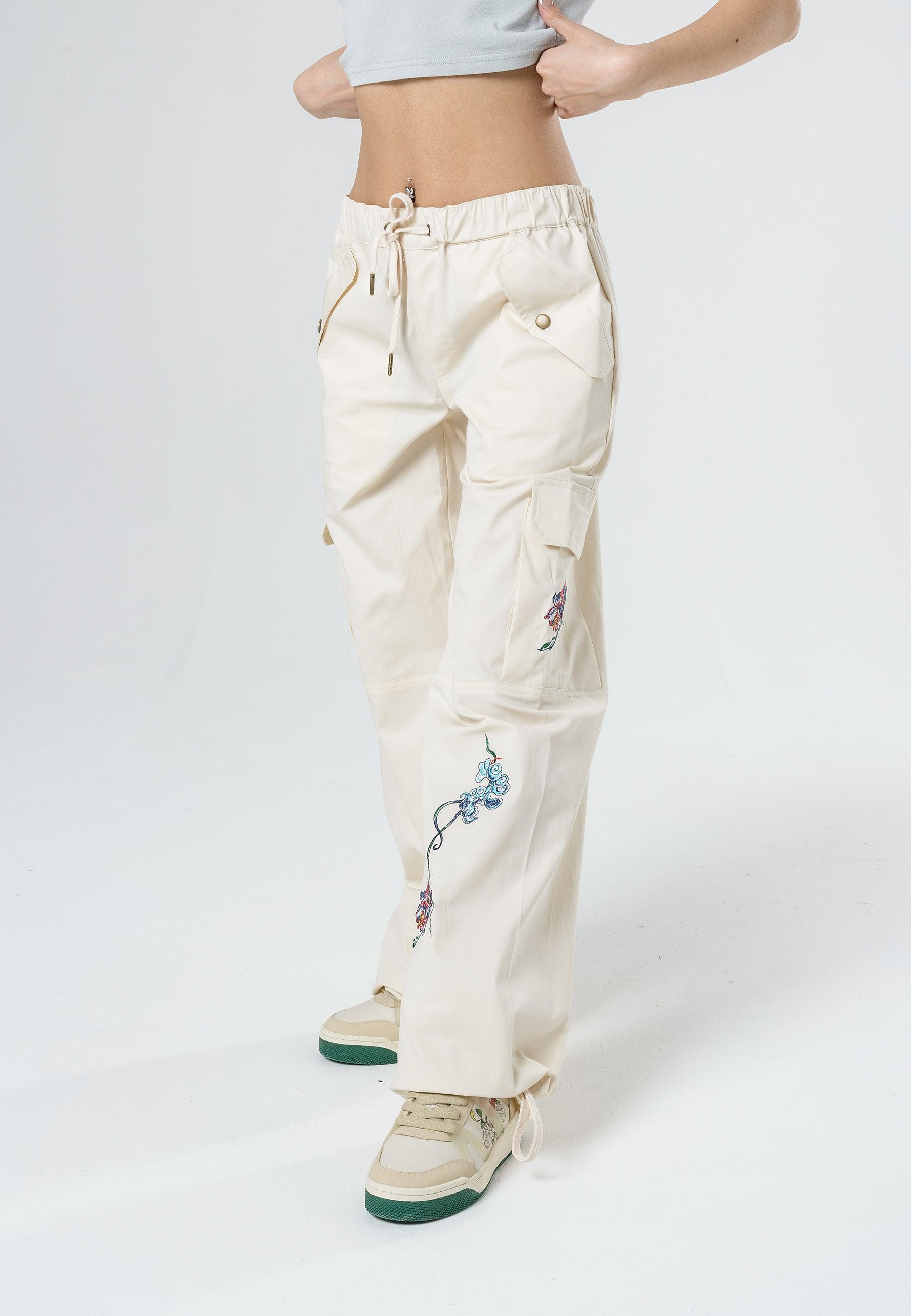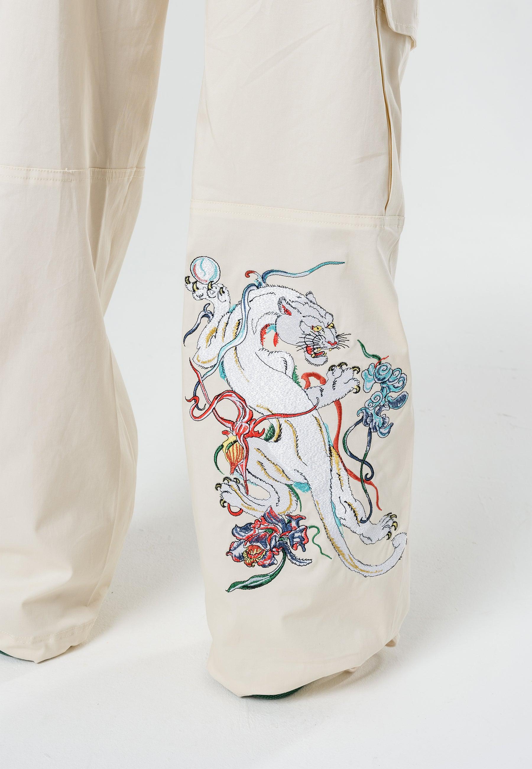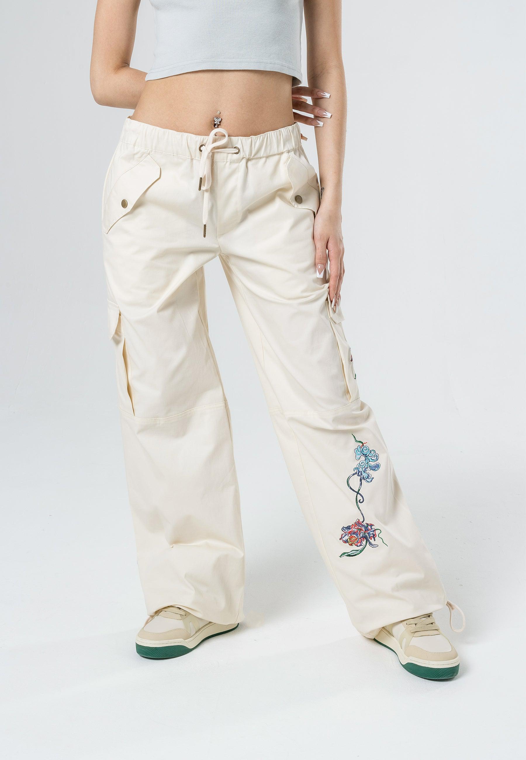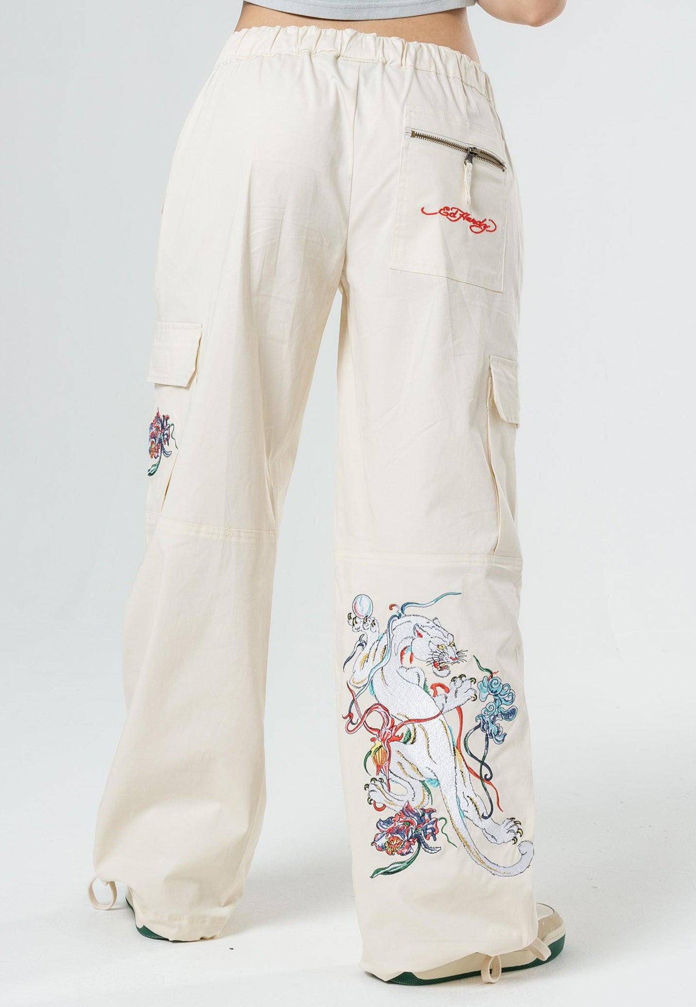 Mystic Panther Cargo Pant-Ecru features the infamous Eds archive of high-definition embroidered Panther at the lower back right leg that come round to the front, as well as the embroidered Ed Hardy logo on the back zip pocket and floral embroidery on left pocket. These comfy cargos are perfect for chill, day and night vibes.