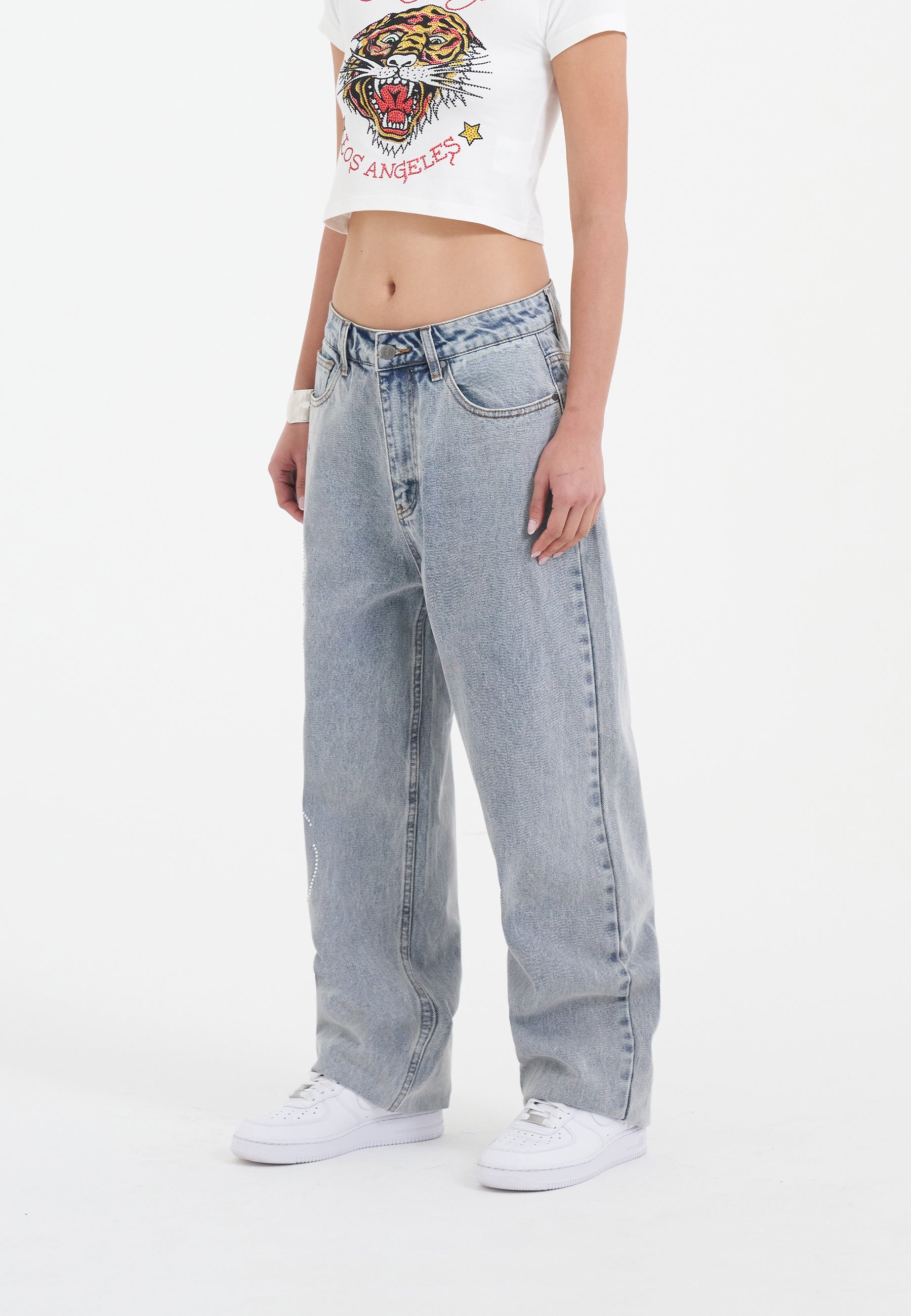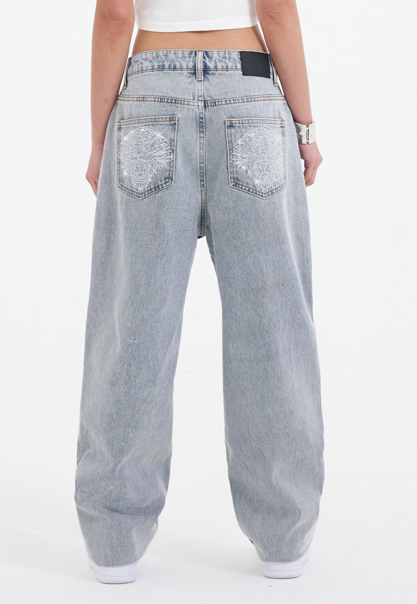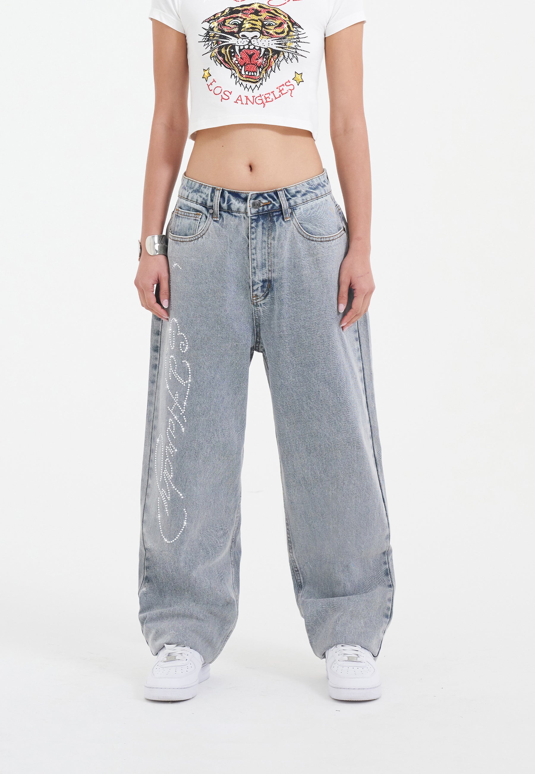 Womens Crystal Roar Diamante Relaxed Denim Trousers Jeans - Bleach