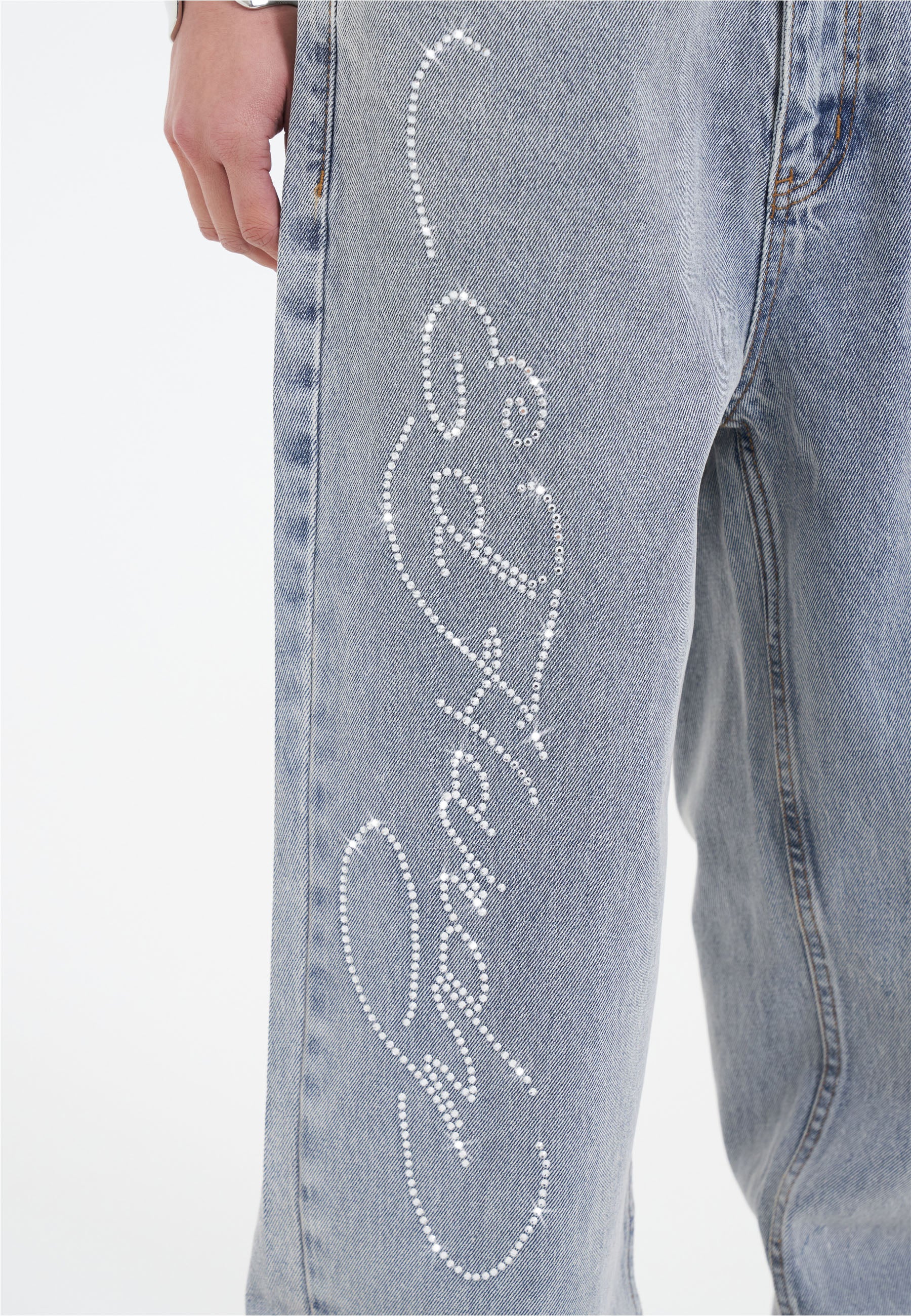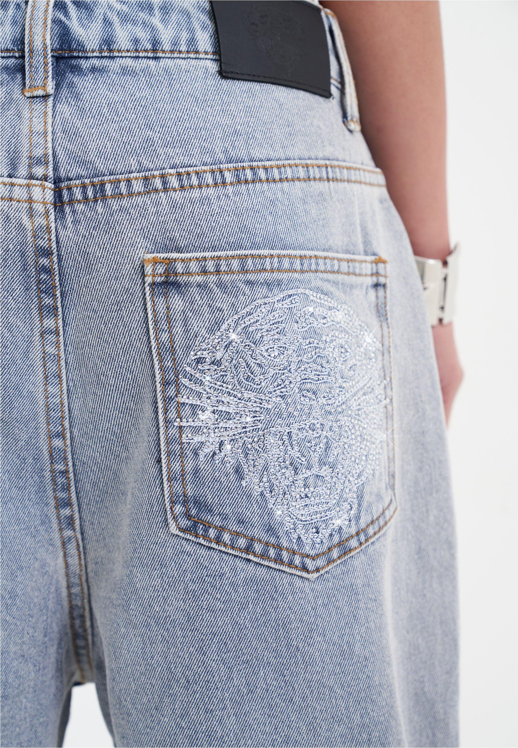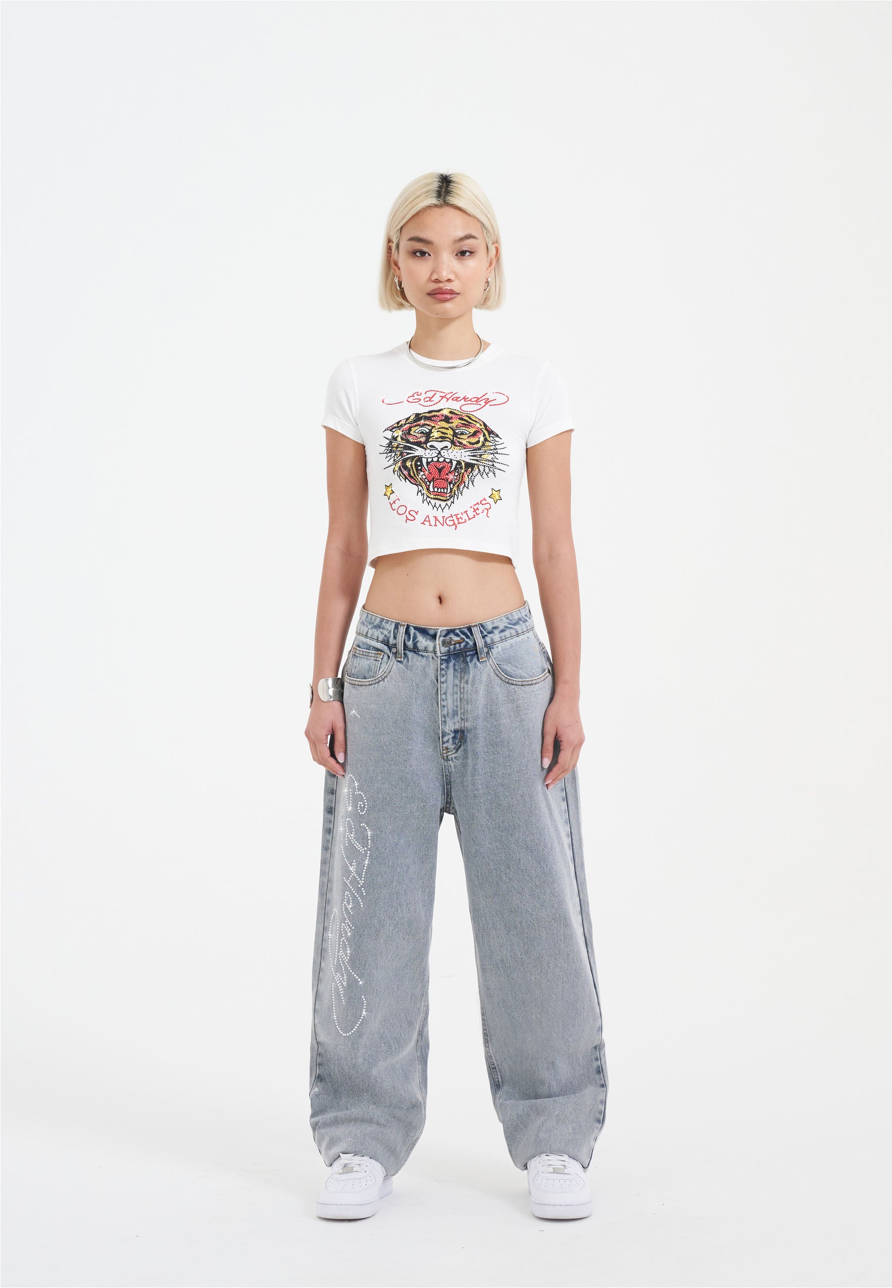 Womens Crystal Roar Diamante Relaxed Denim Trousers Jeans - Bleach