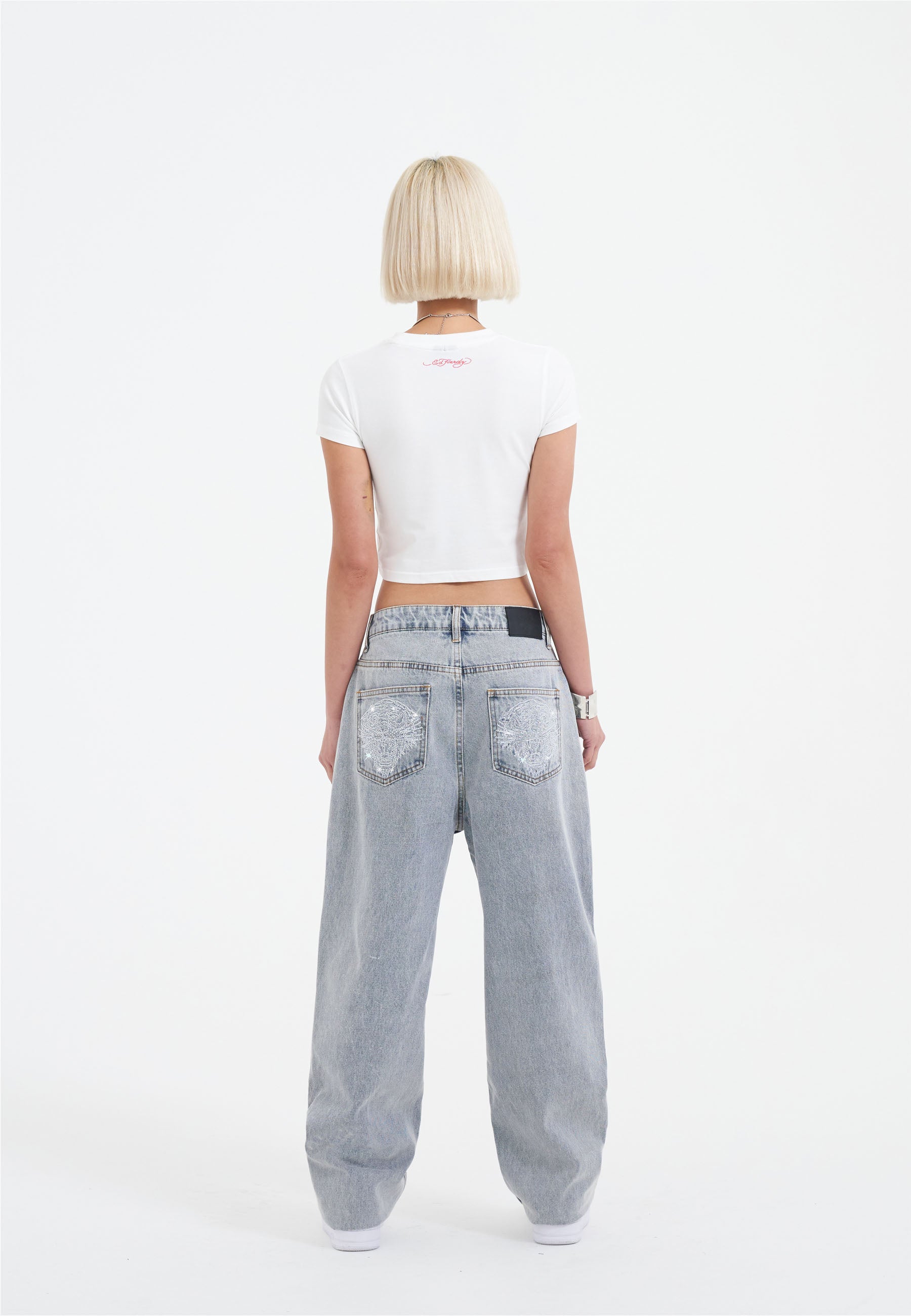 Ed Hardy seamlessly captures the essence of Punk's unbridled creativity, infusing it into every stitch and tonal embellishment of the Crystal Roar jeans.