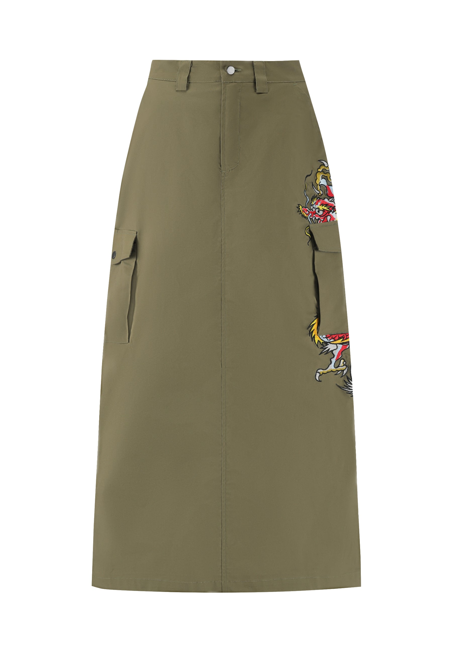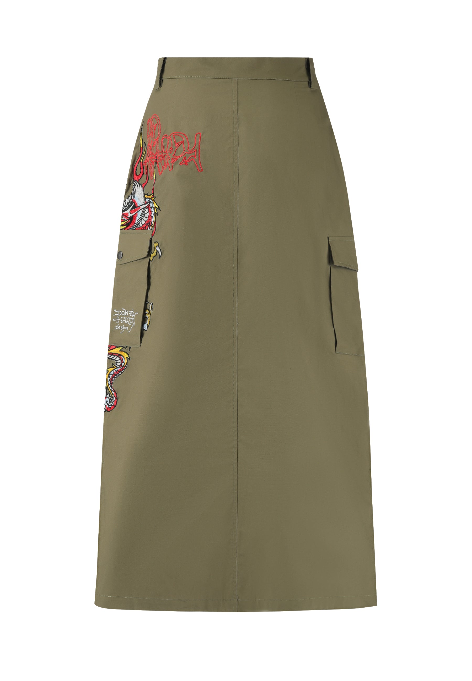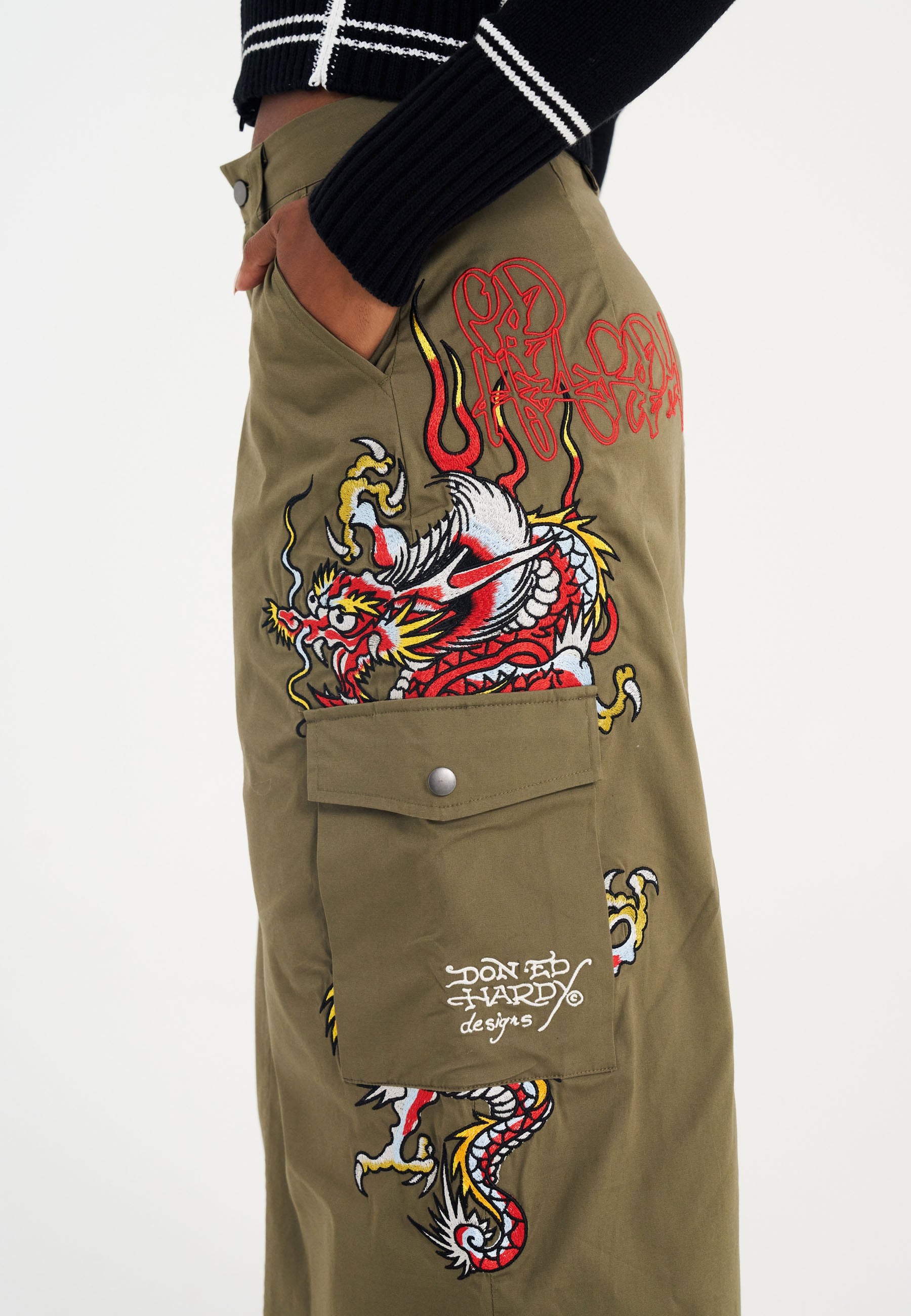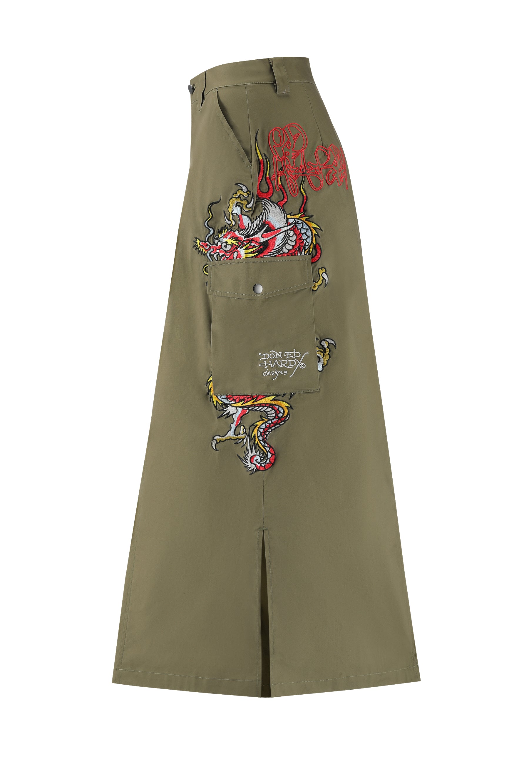 This green cargo skirt features full-color dragon flame embroidery along the left side. Crafted from a comfortable cotton blend, it offers a regular fit with practical details like poppered cargo pockets, front pockets, and side seam splits for ease of movement. The center front zip fastening adds a modern edge, while the new signature style logo and Don Ed Hardy's emblem bring that iconic touch to this standout piece.