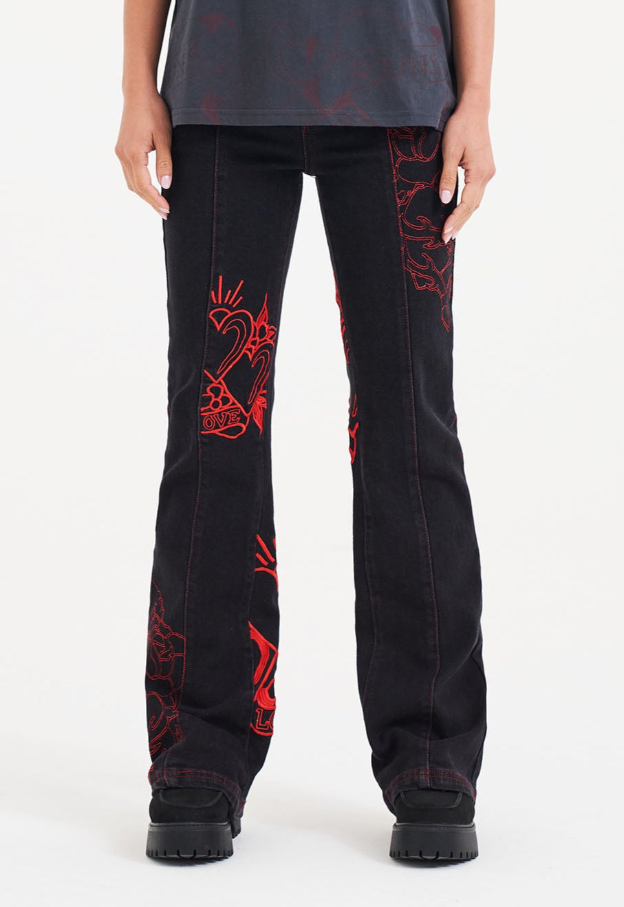 Womens Rouge Hearts Flared Denim Trousers Jeans - Black