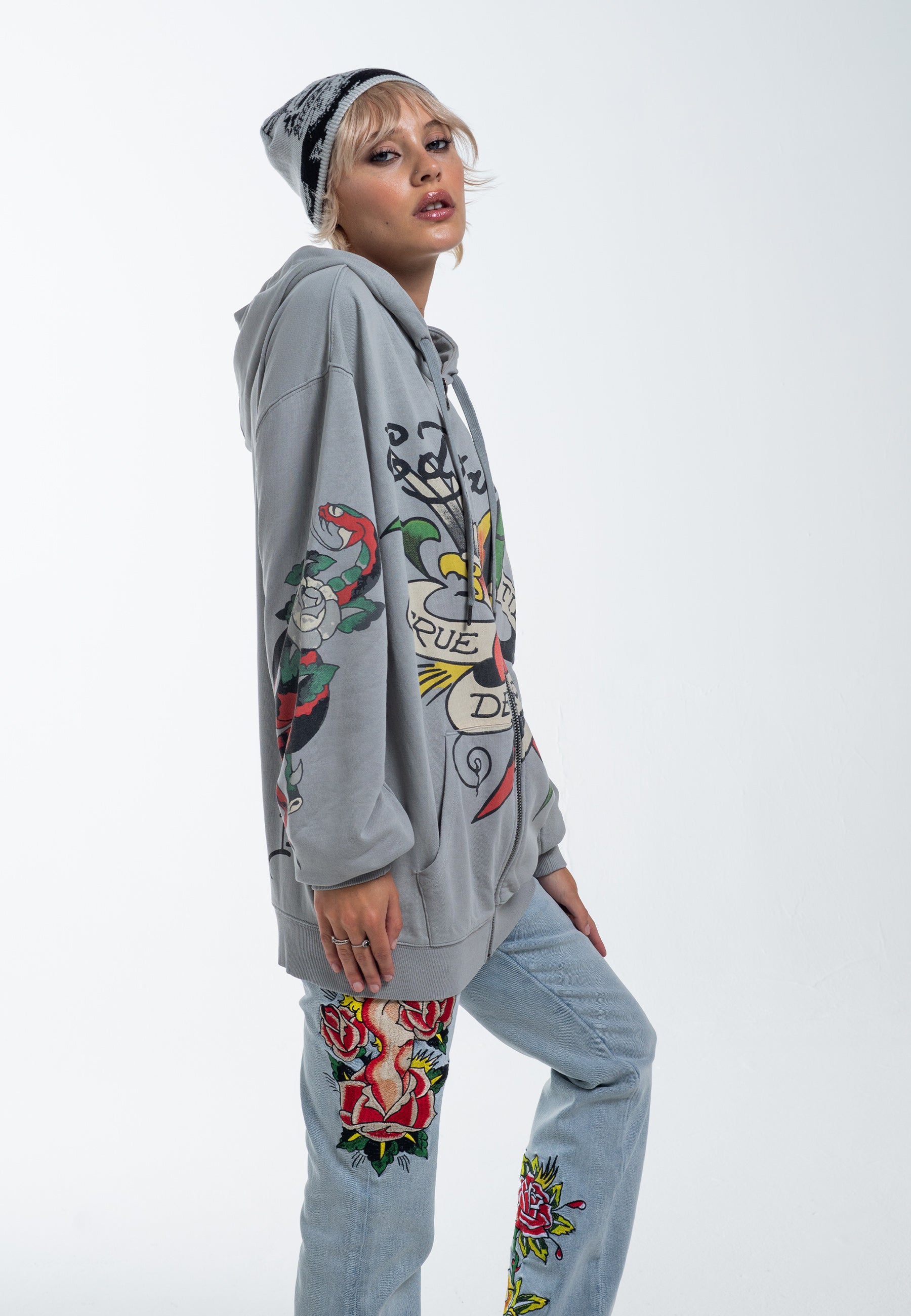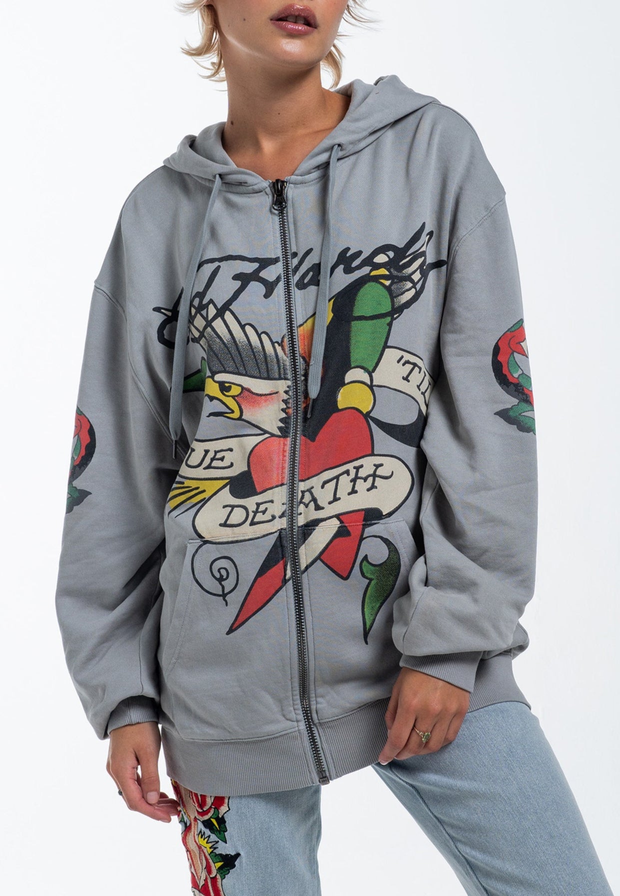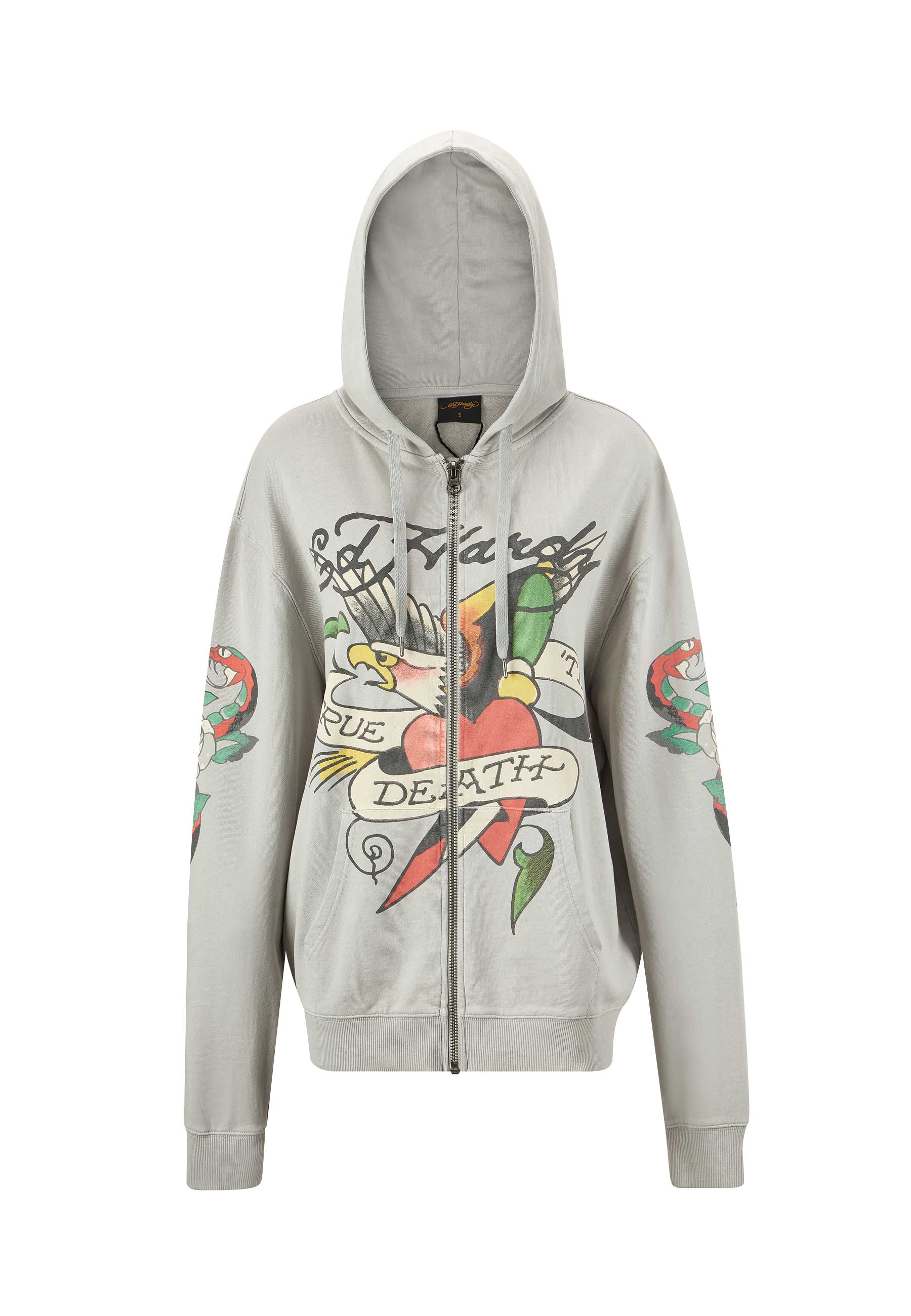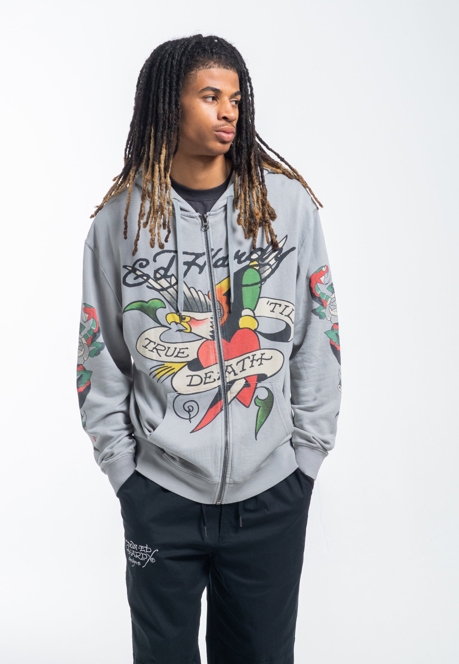 The True Til Death graphic has become a timeless icon of Ed Hardy, reimagined over the years with new configurations for every generation to adore. Step into the season with the classic True Til Death Zip-Thru Hoodie, proudly featuring the enduring emblem on the chest.