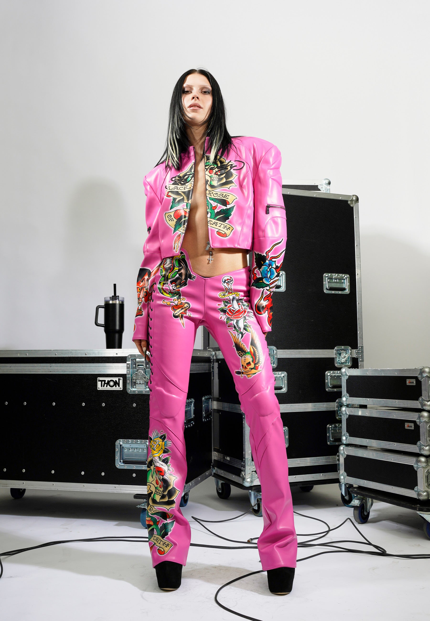 This striking piece blends the rebellious spirit of a classic moto jacket with Ed Hardy’s iconic tattoo art, creating a look that’s both fierce and romantic.