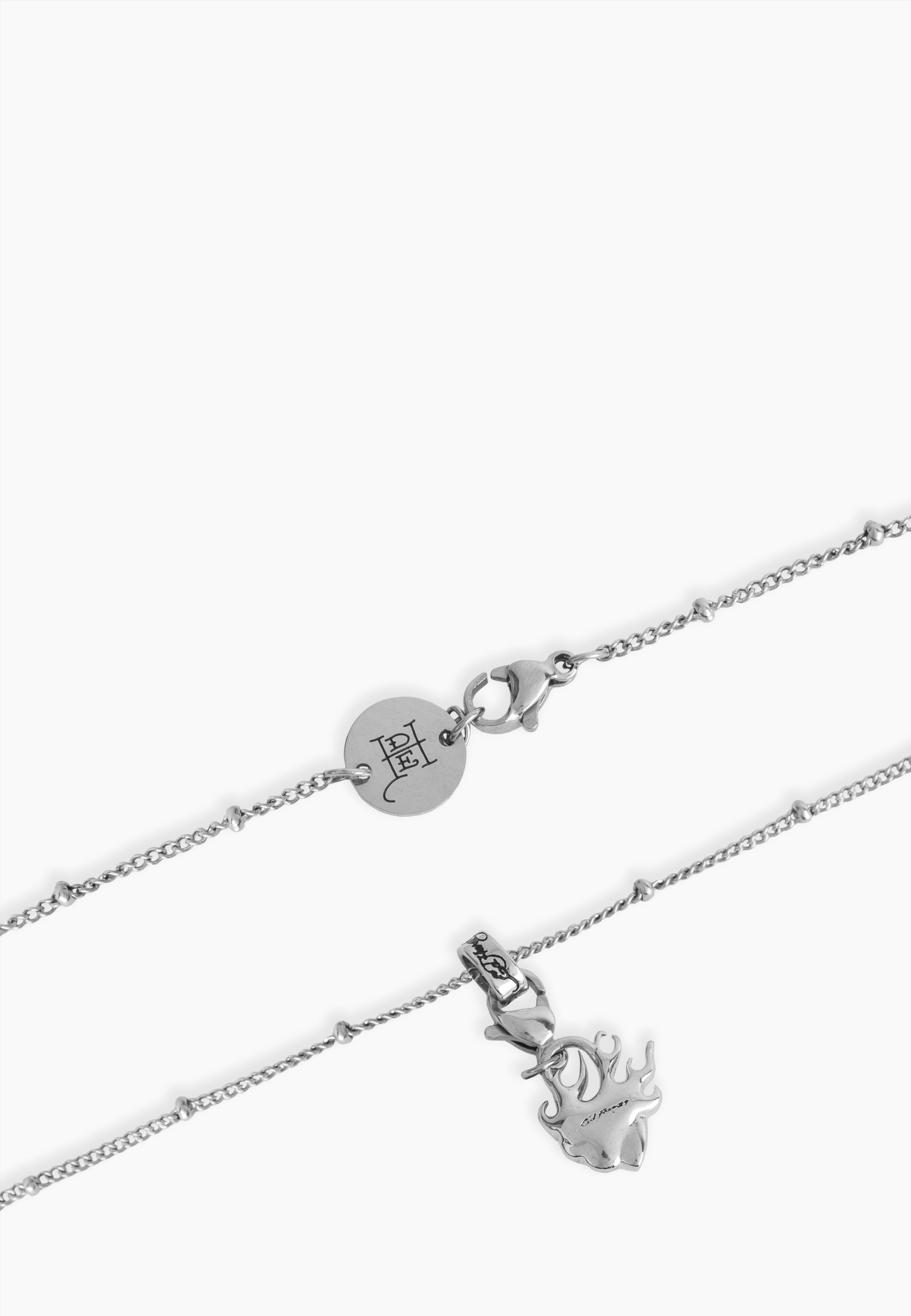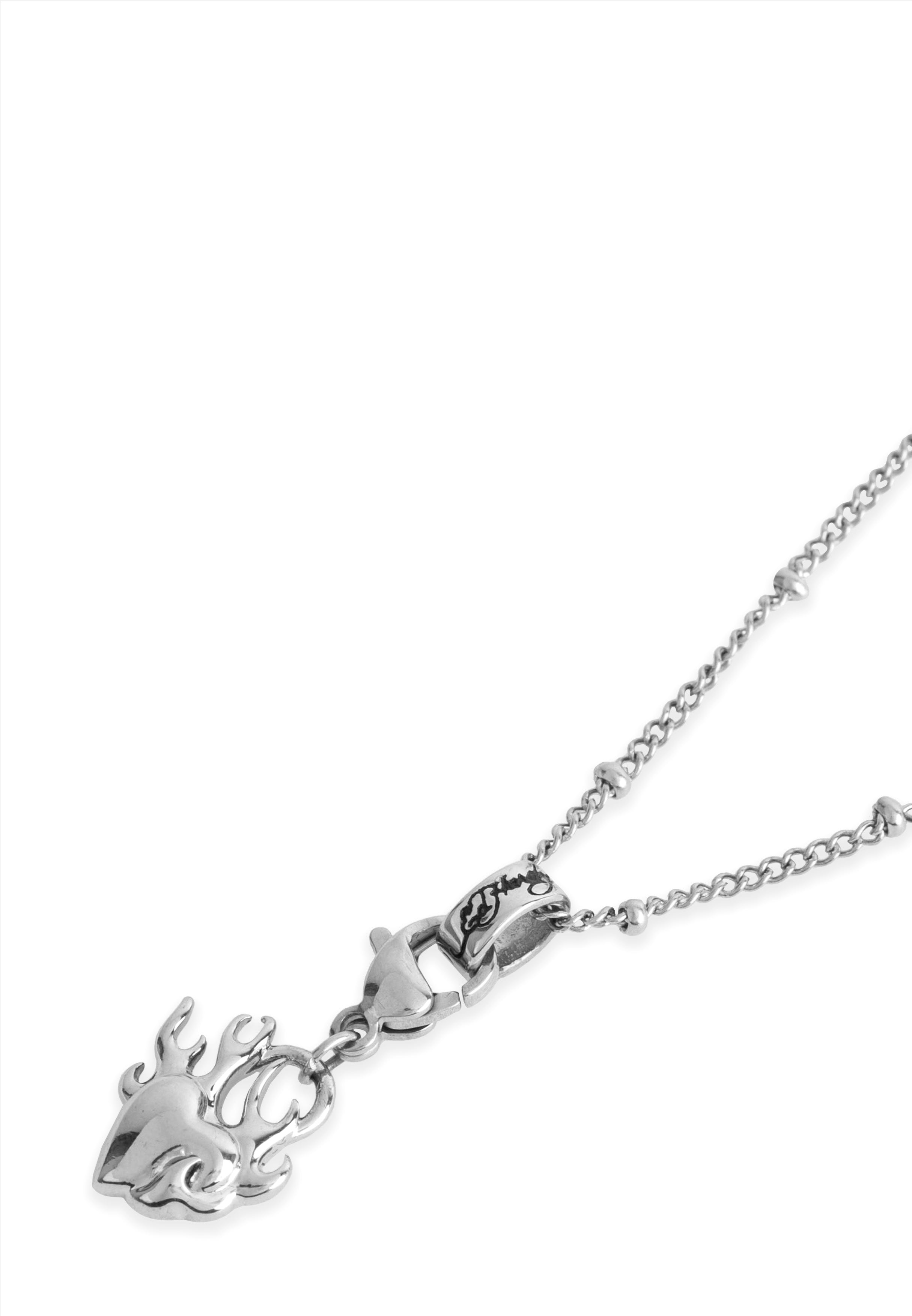 Stainless steel beaded chain necklace with Ed Hardy thick loop bale and Flaming Heart pendant in a silver finish.
