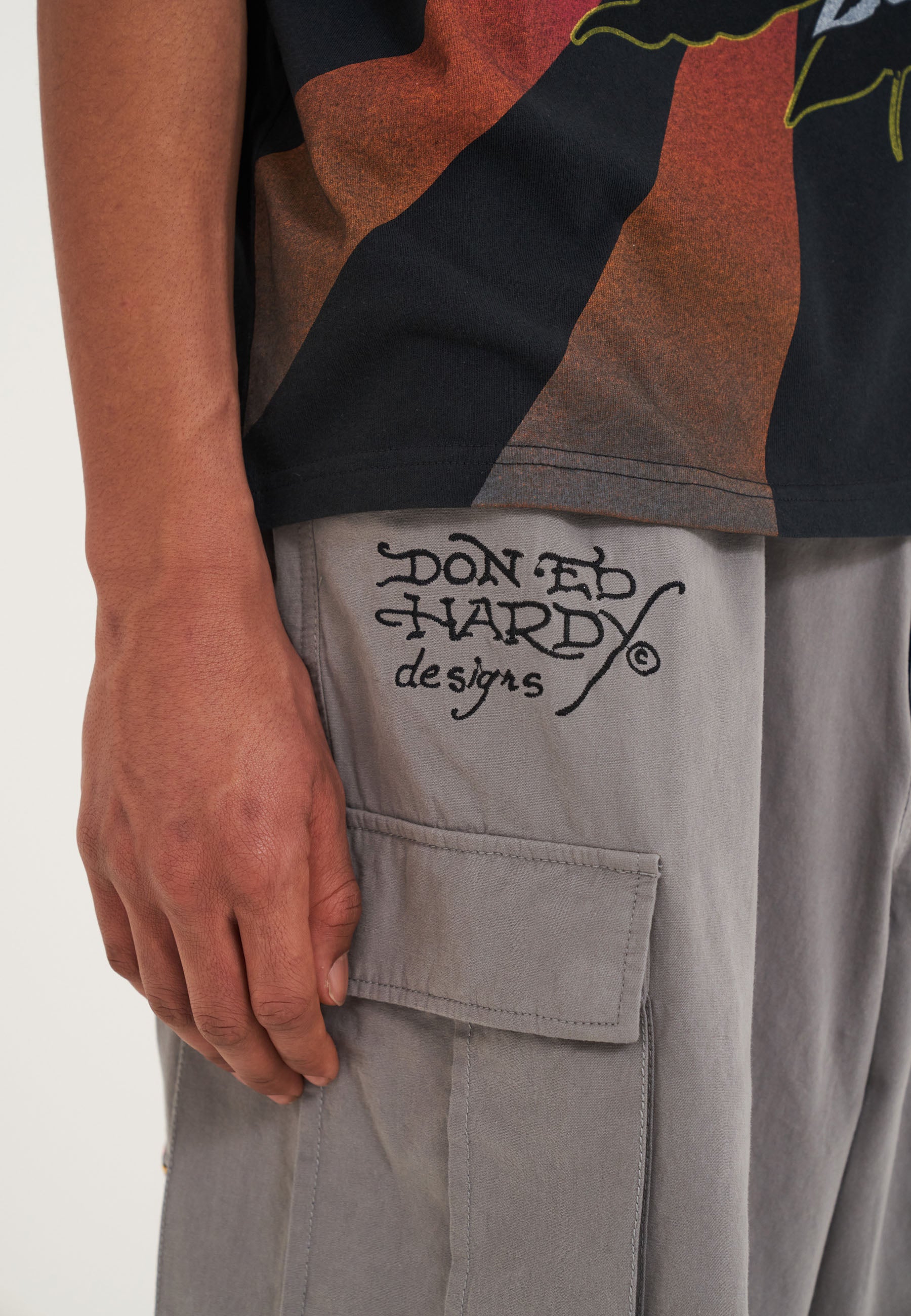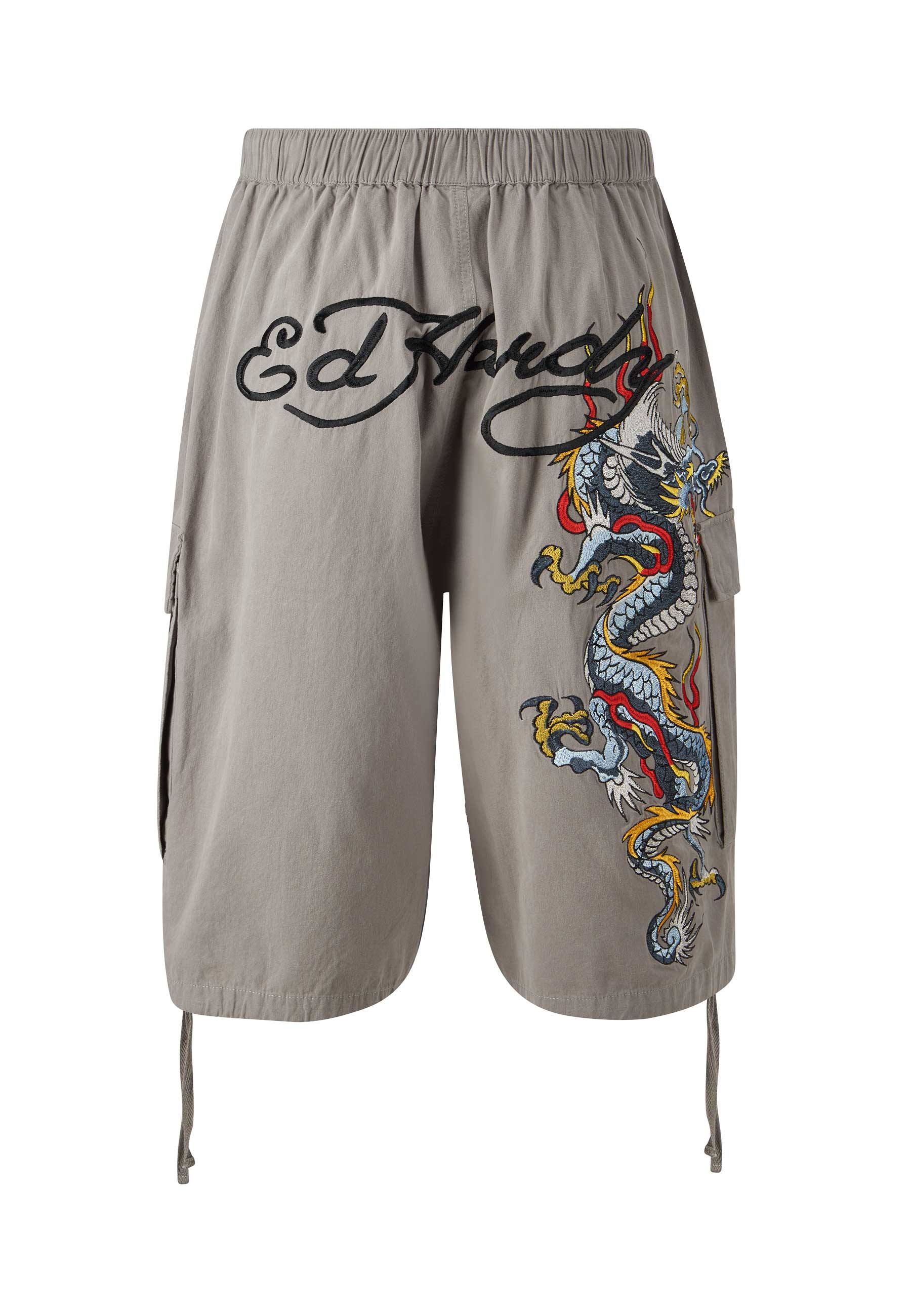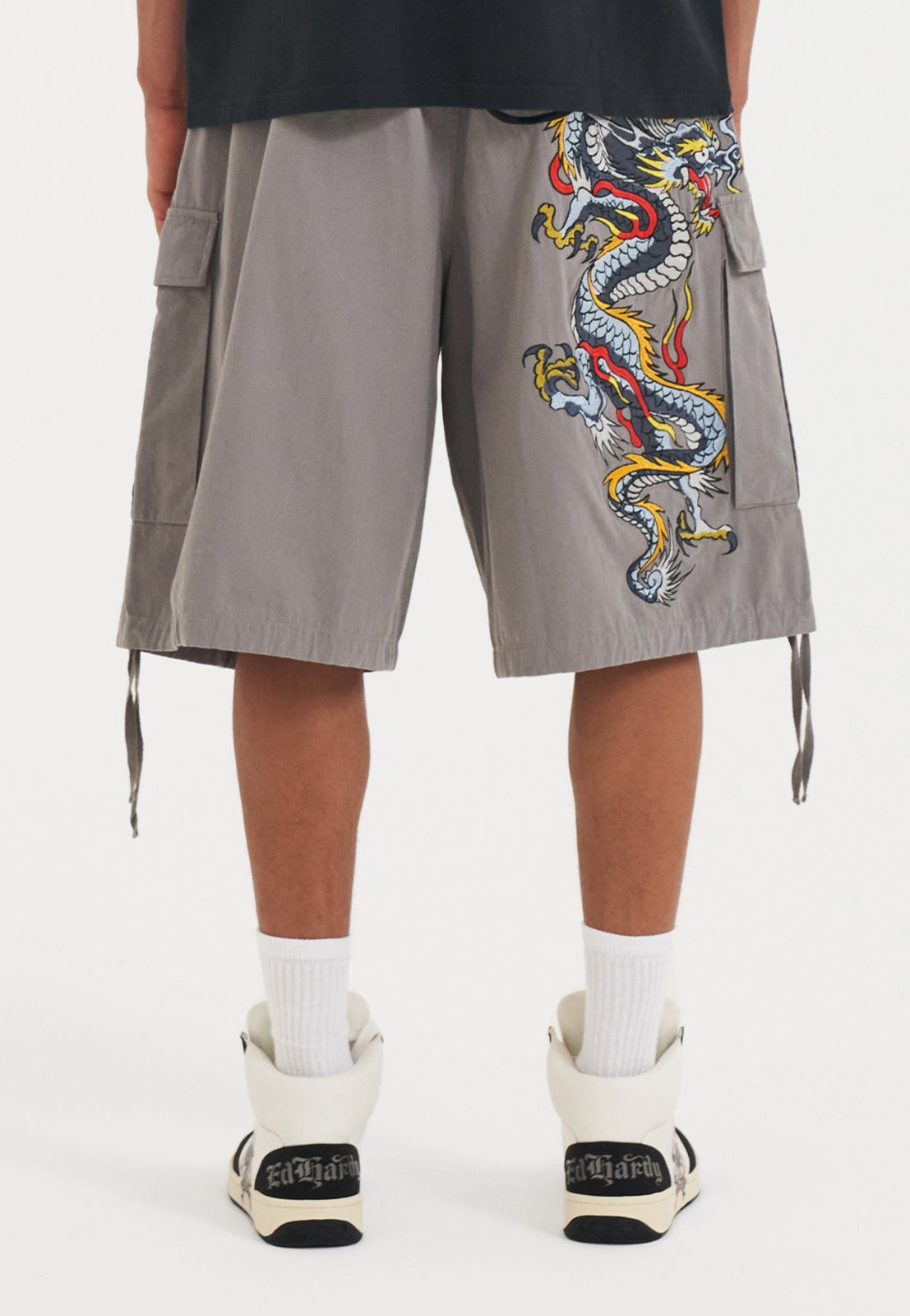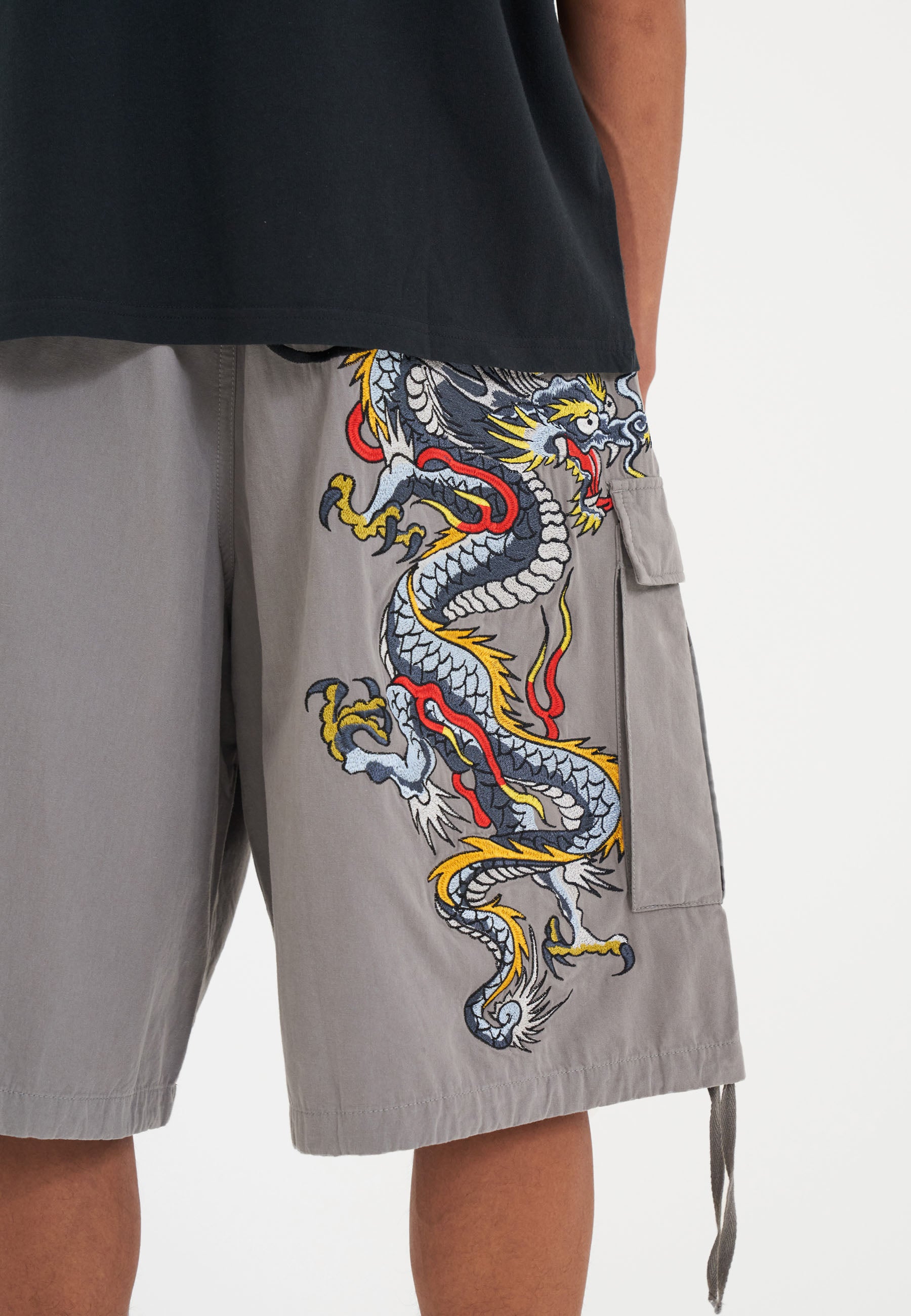 RELAXED FIT WOVEN CARGO SHORT IN GREY WITH FULL COLOUR DRAGON CRAWL EMBROIDERY