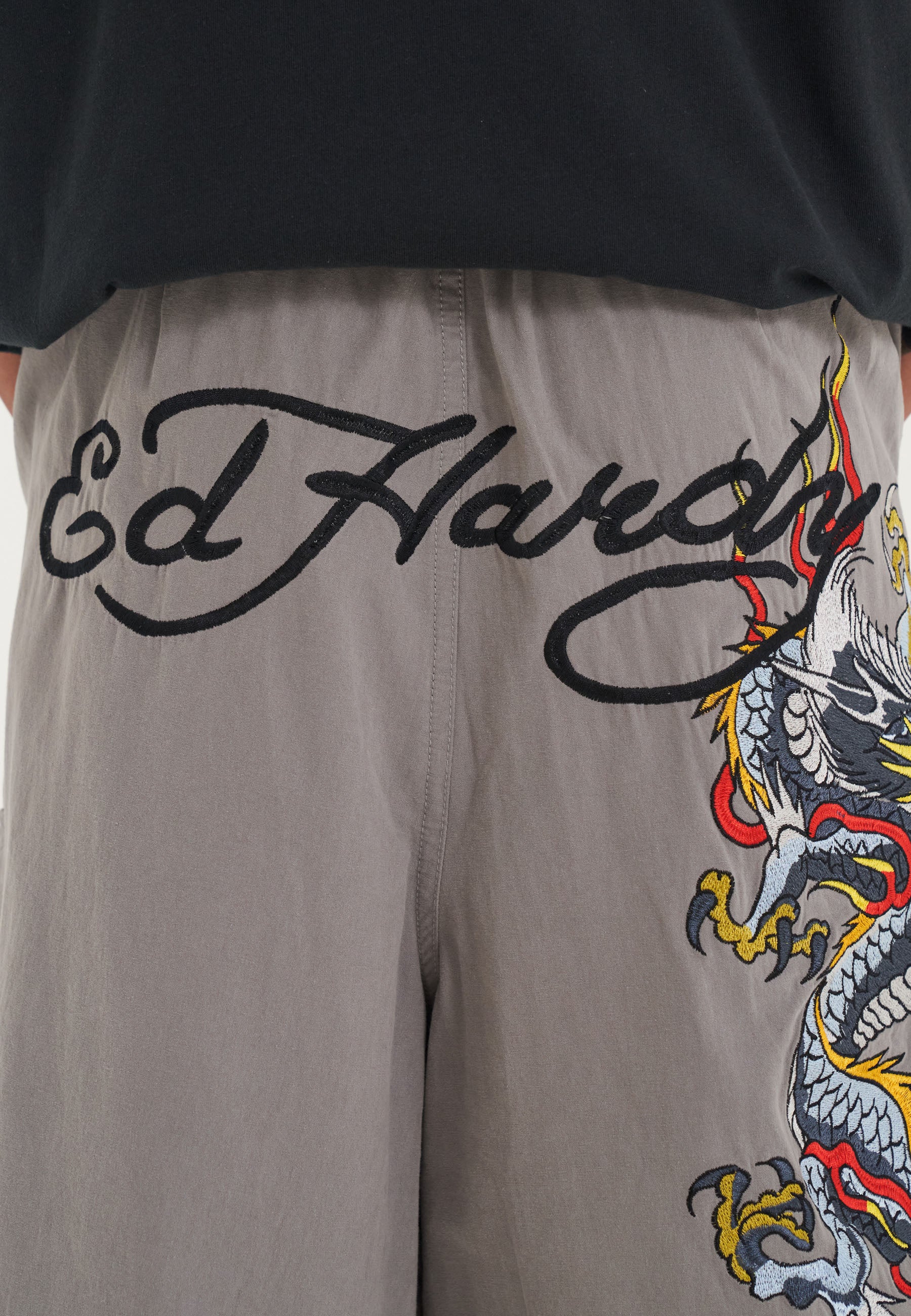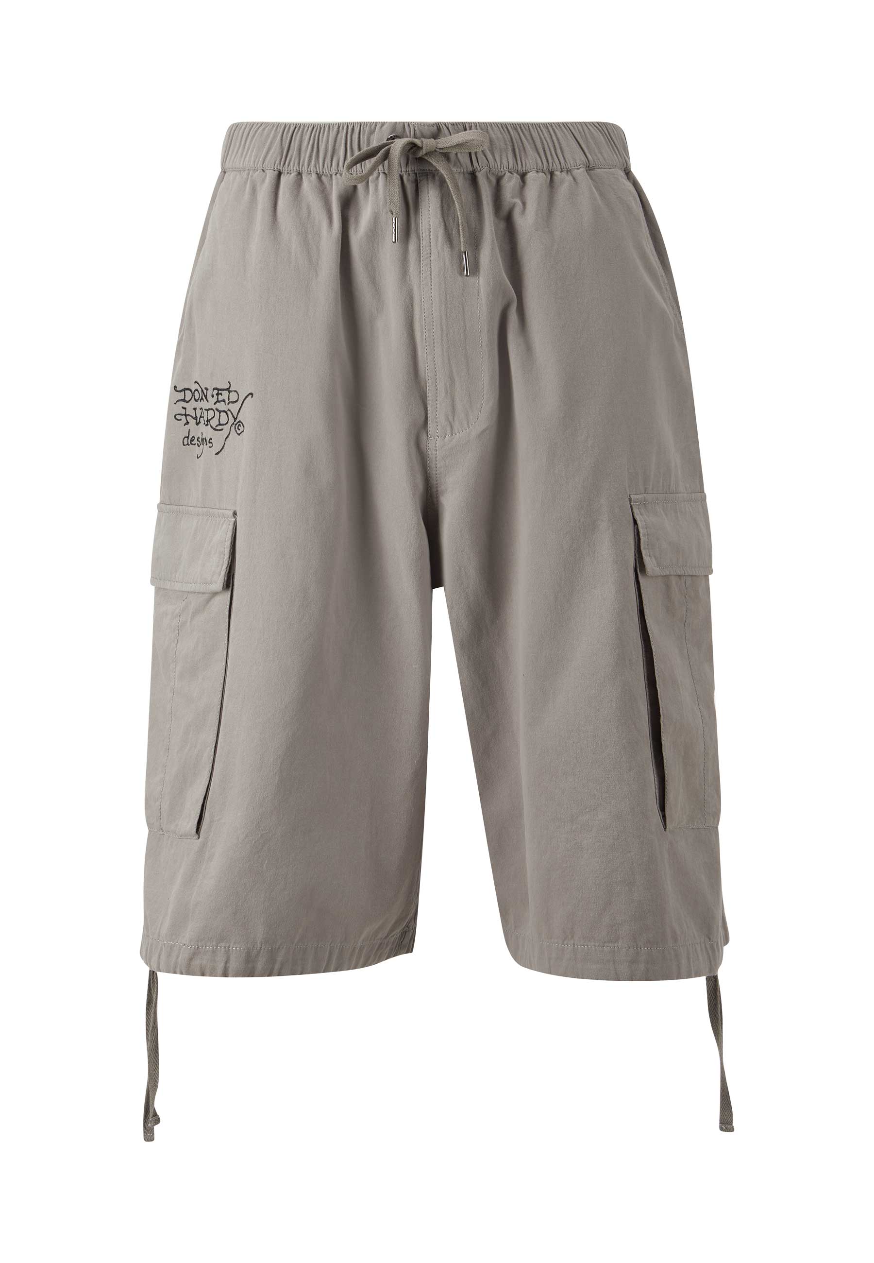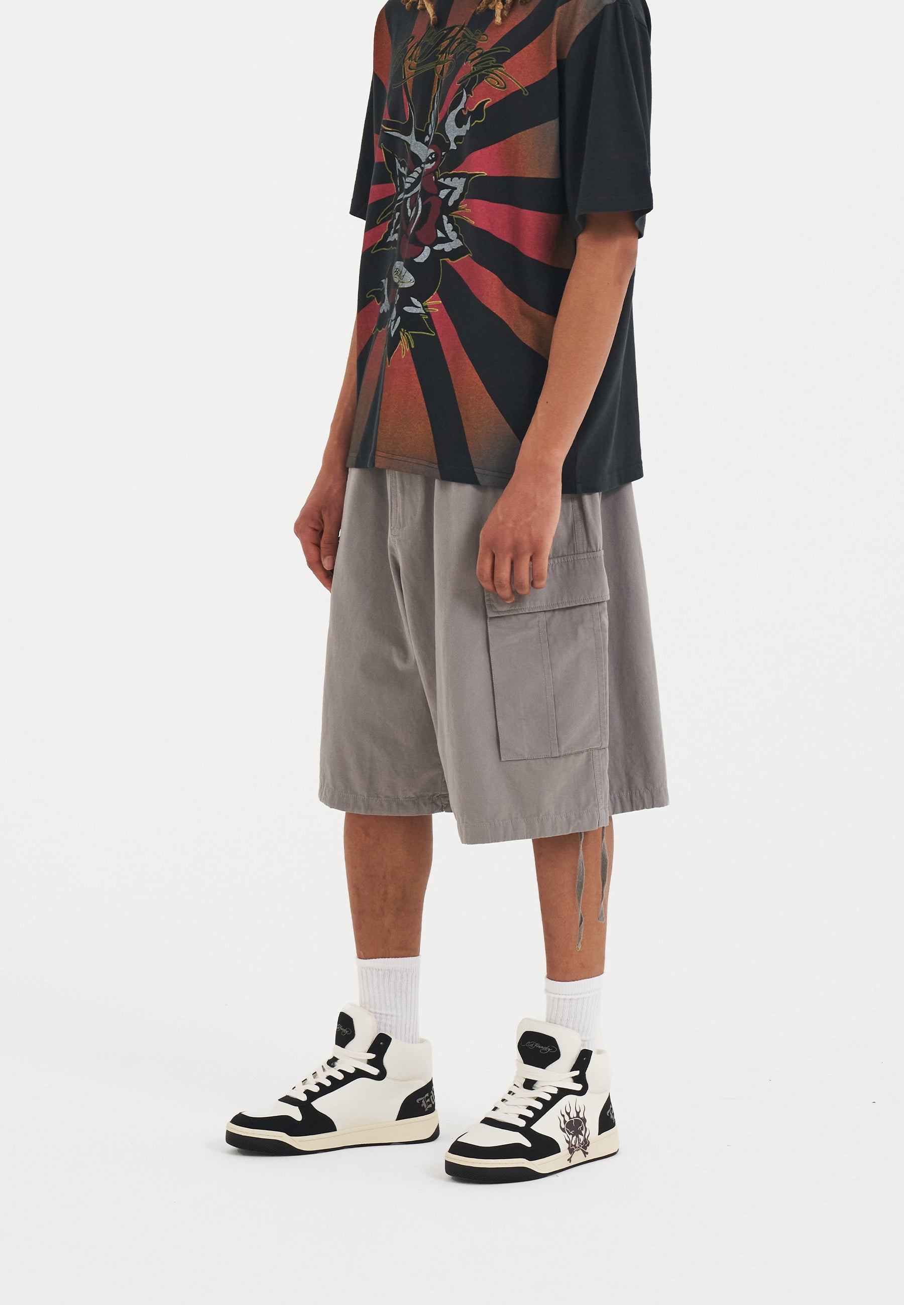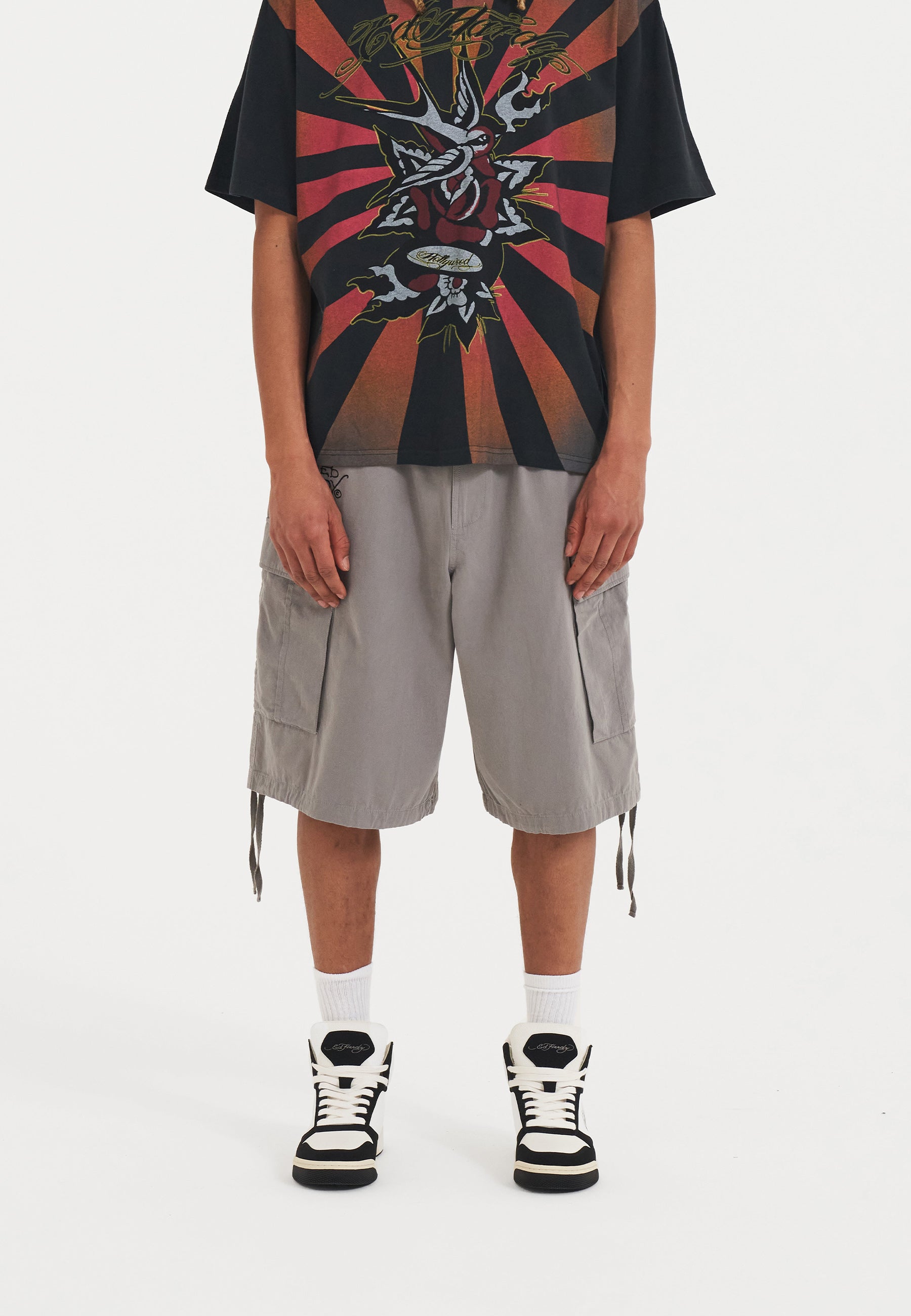 RELAXED FIT WOVEN CARGO SHORT IN GREY WITH FULL COLOUR DRAGON CRAWL EMBROIDERY