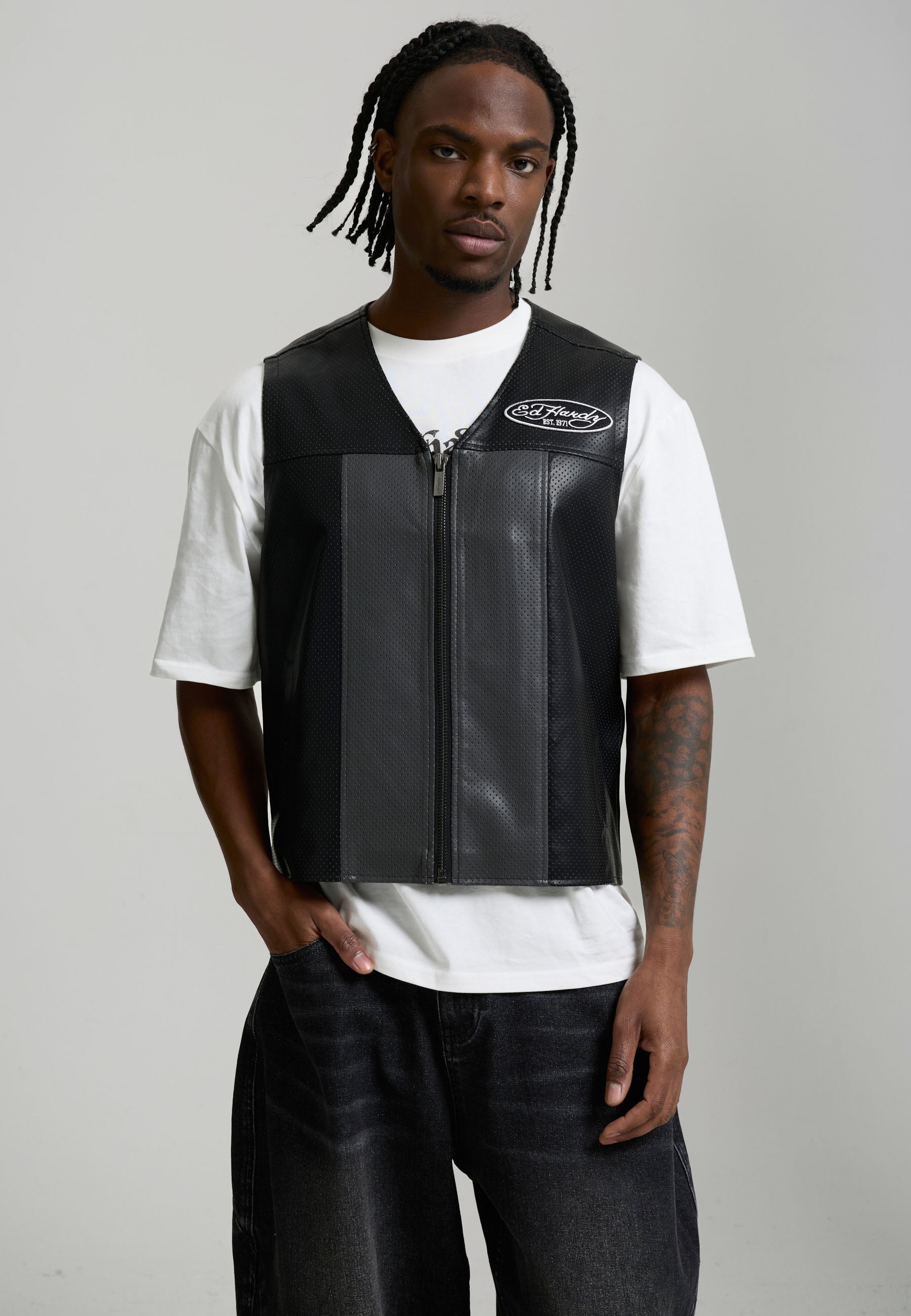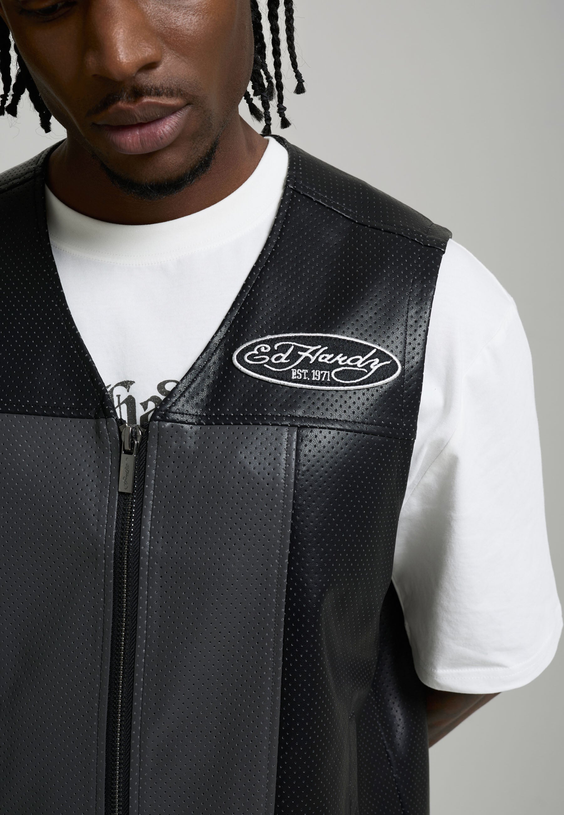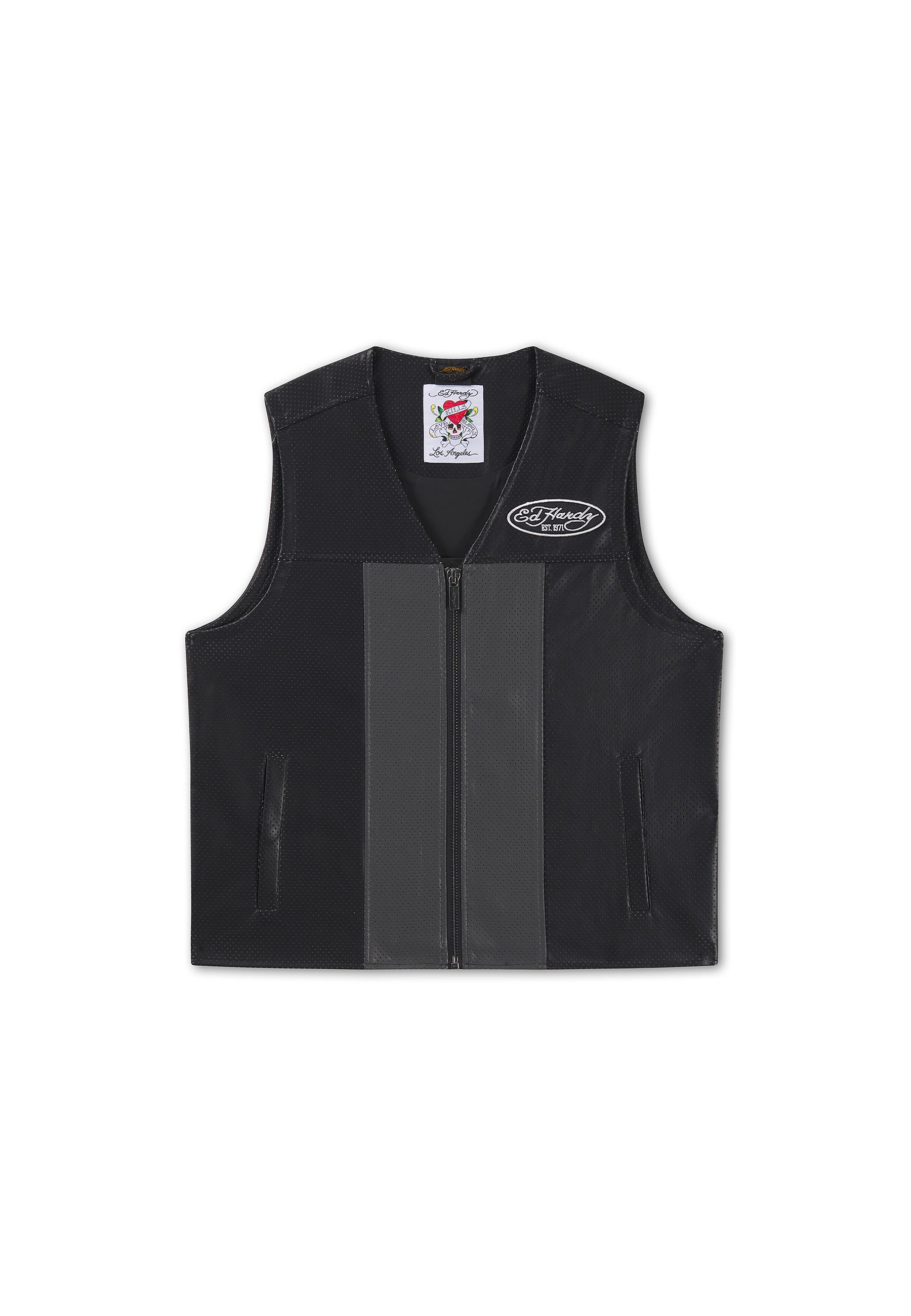 Mens Ed Hardy Pu Airtex Leather Vest - Black / Grey