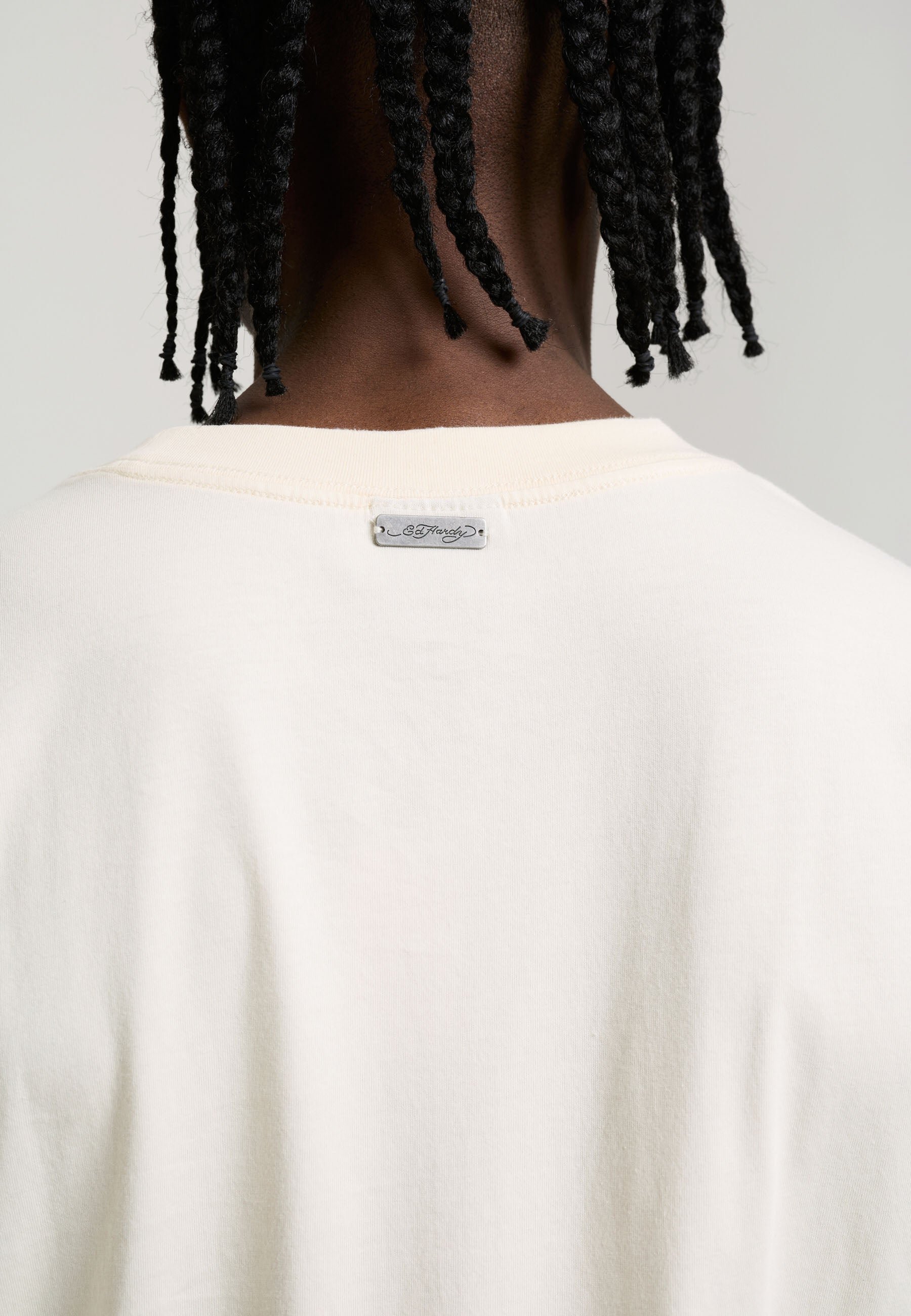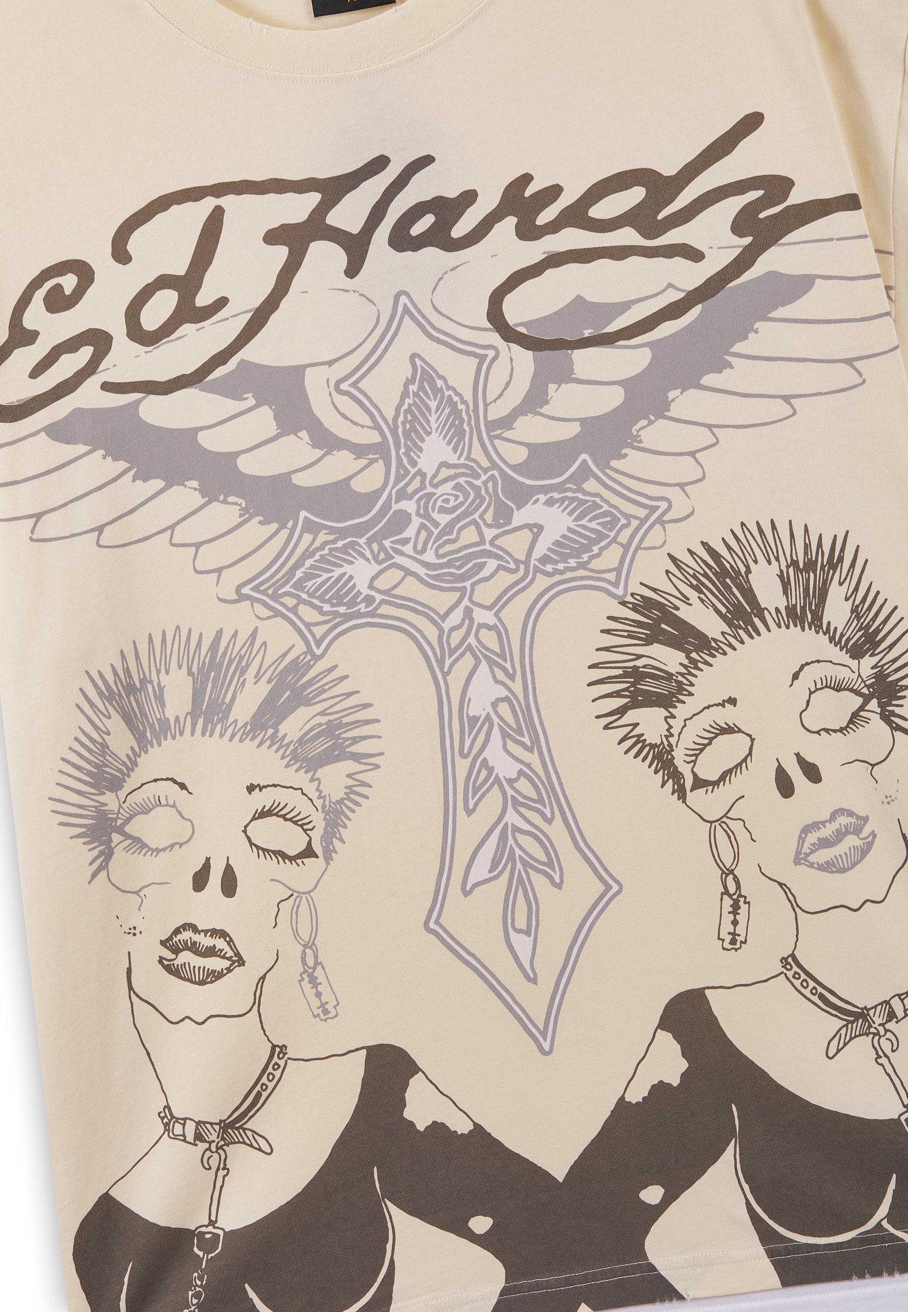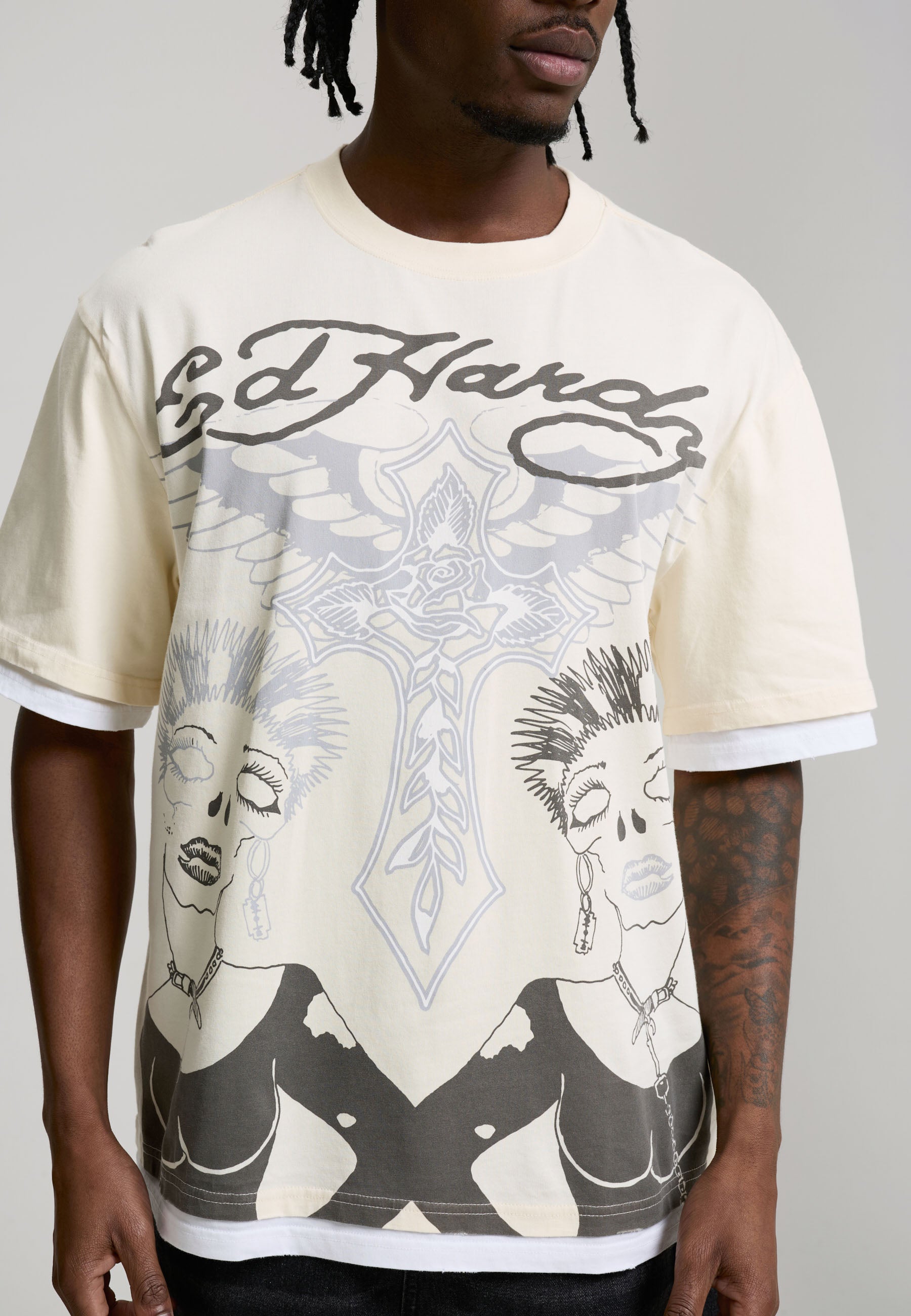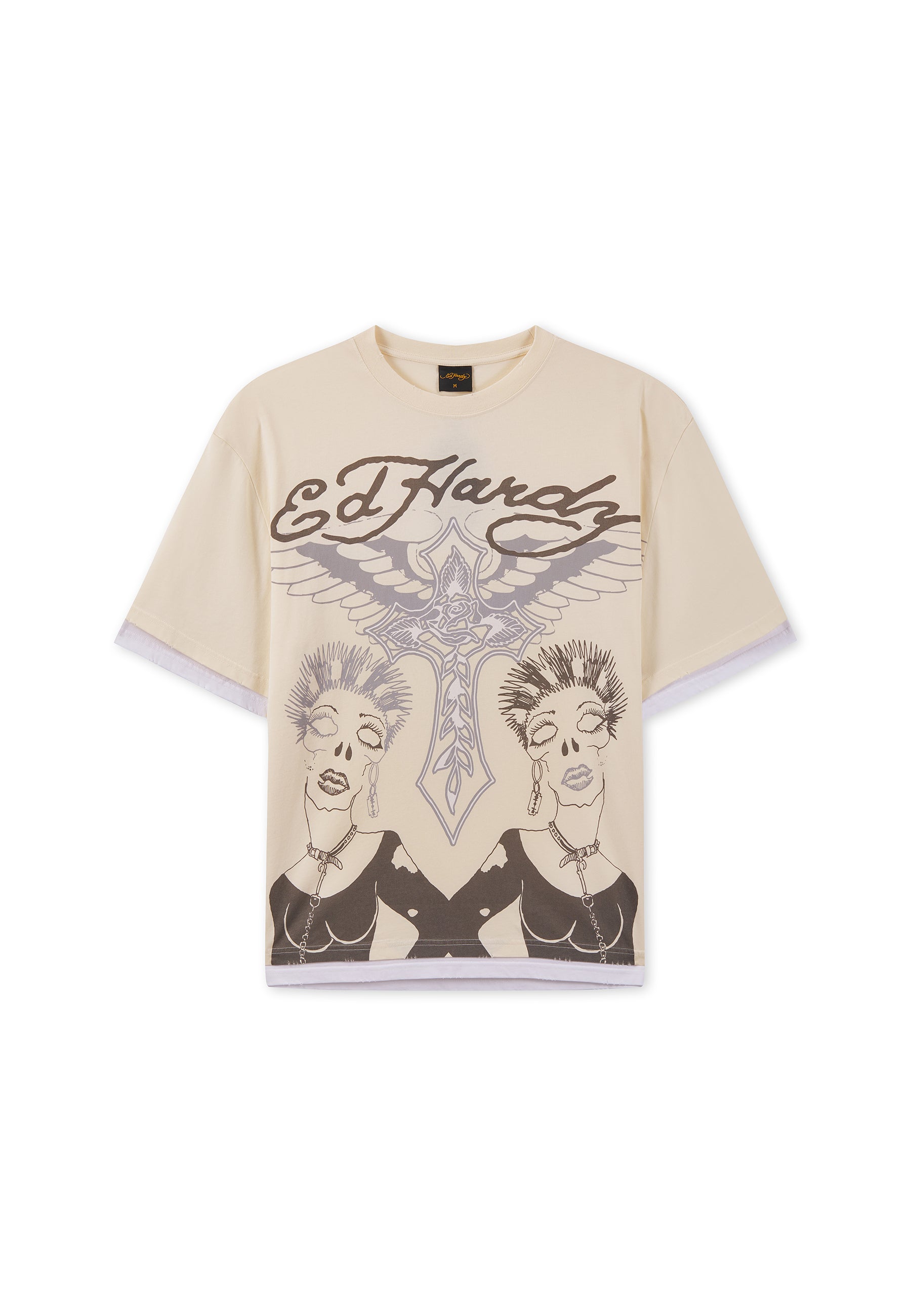 Mens Ed Hardy Punk Graphic Double Layer Relaxed T-Shirt - Ecru