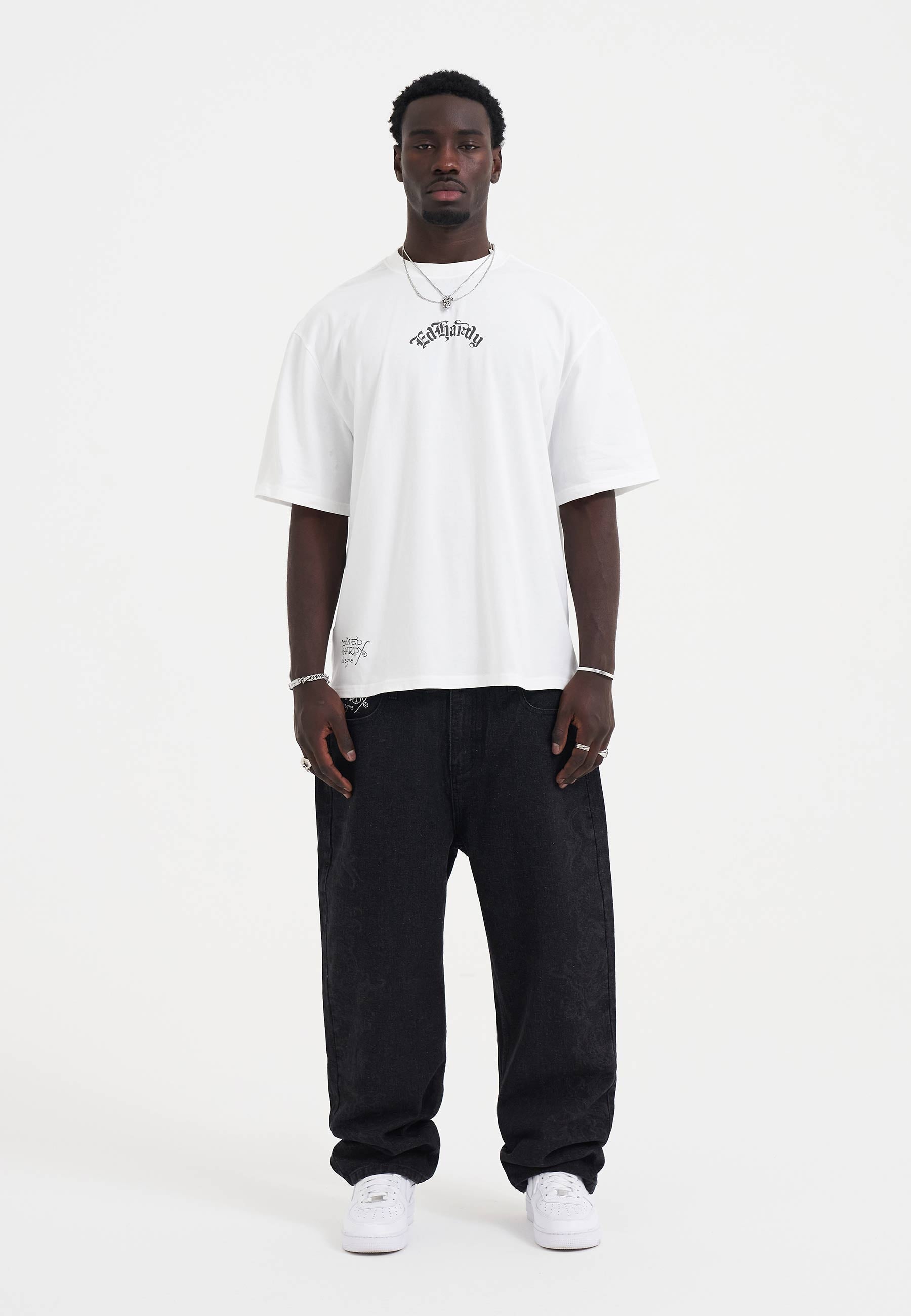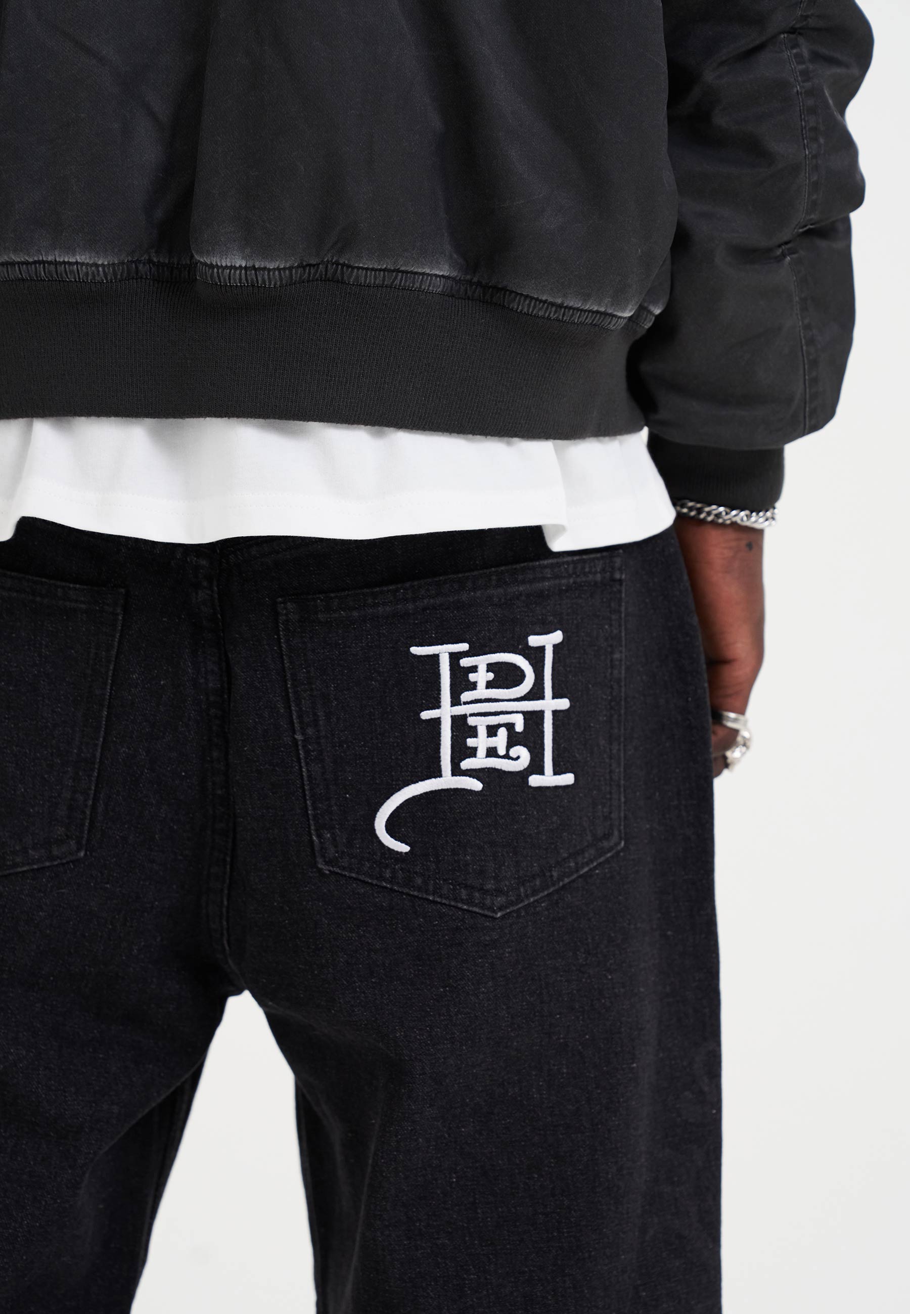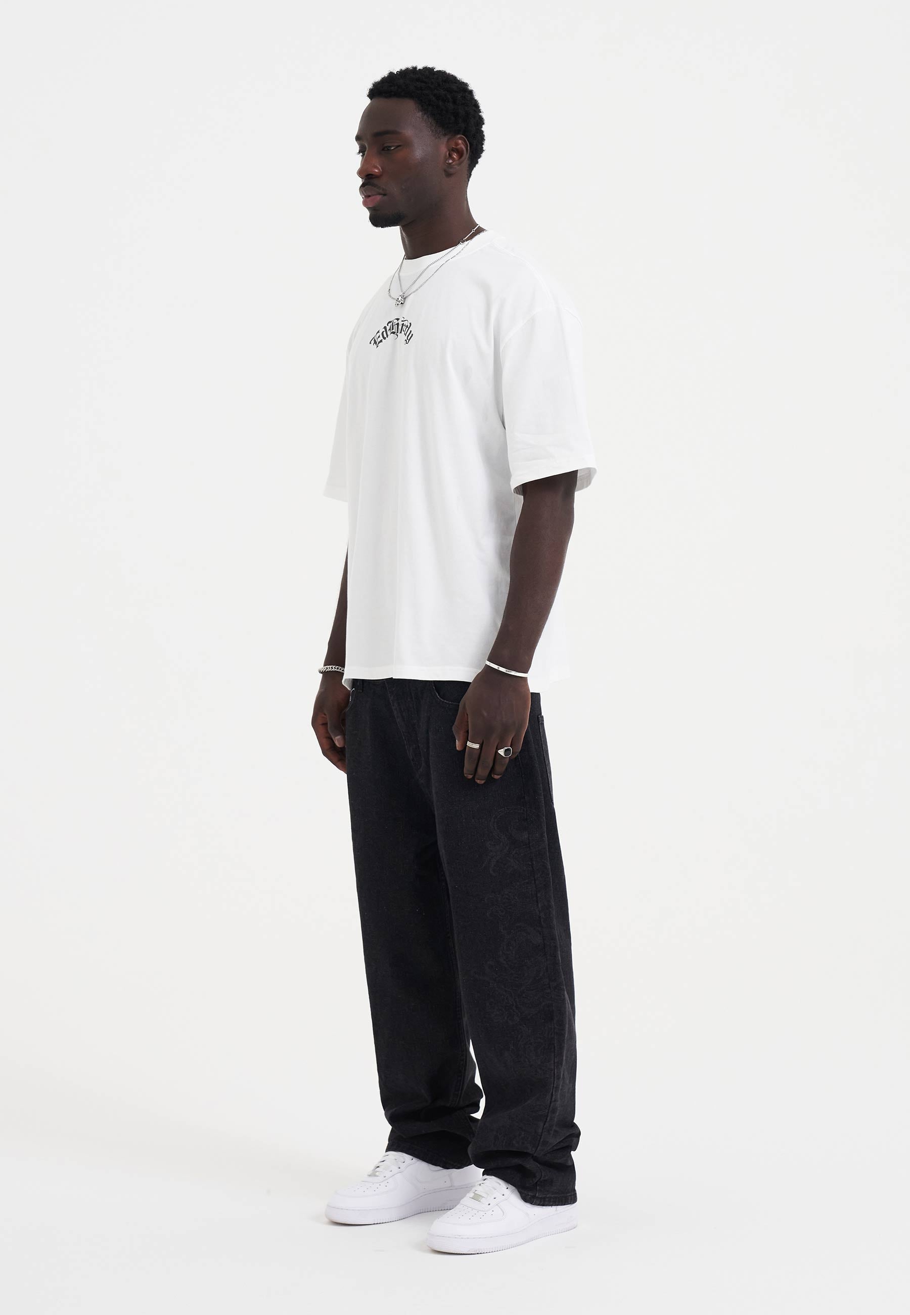 Mens Laser Etched Dragon Repeat Denim Trousers Jeans - Black