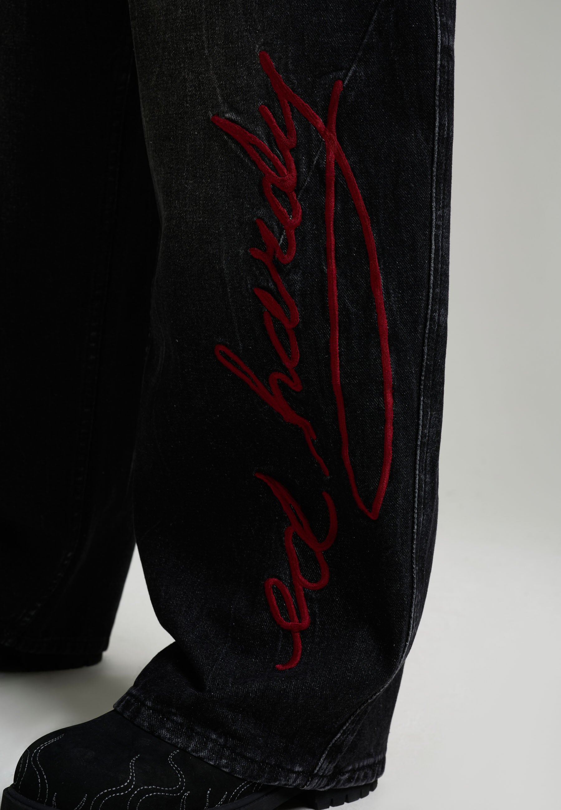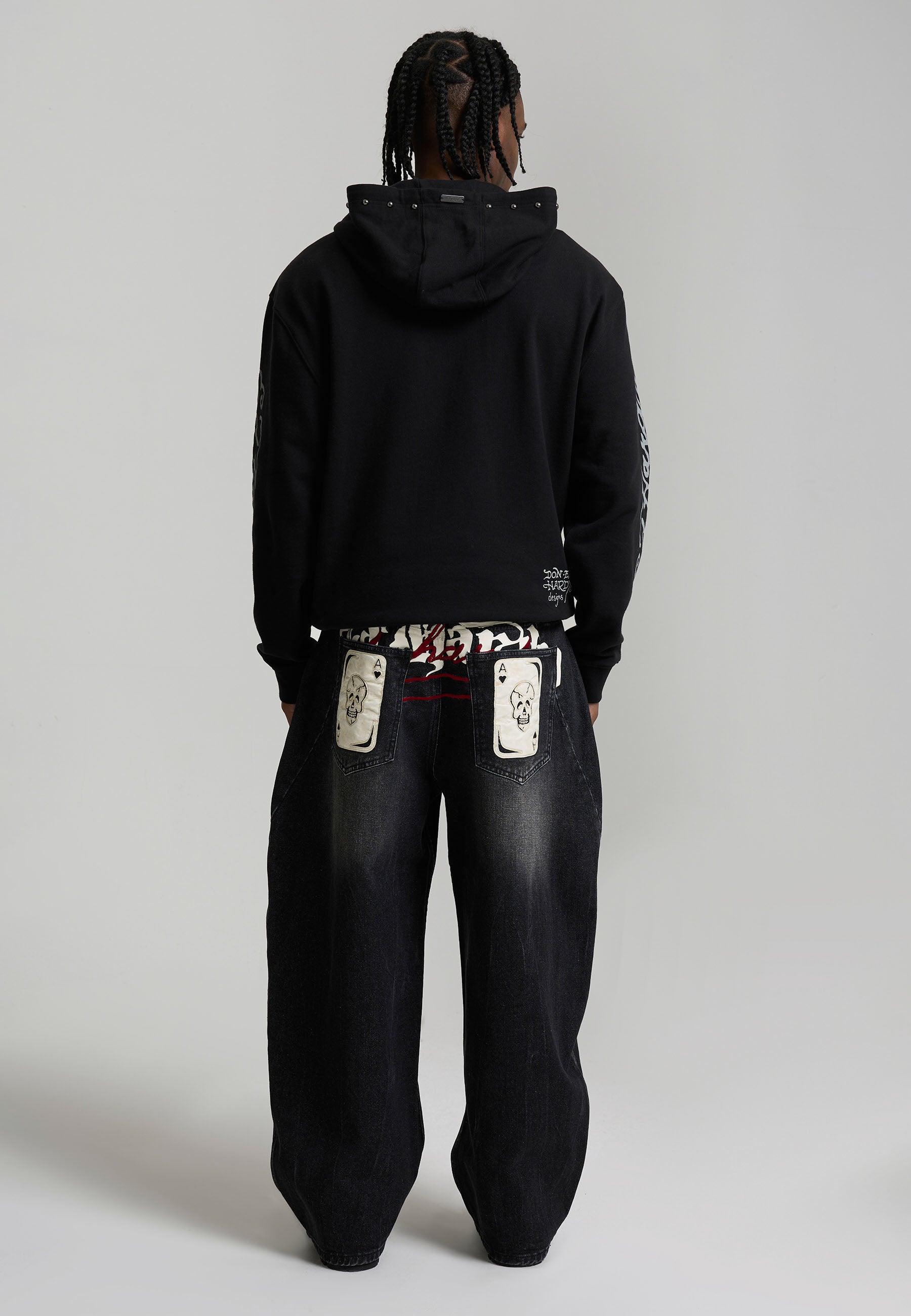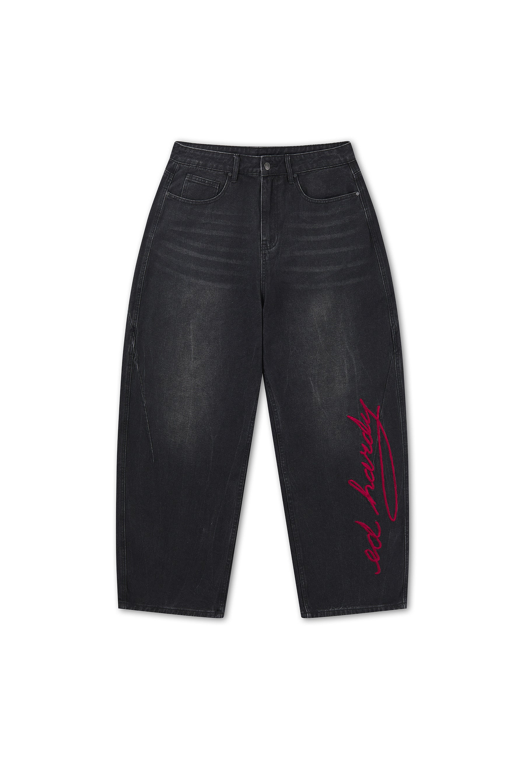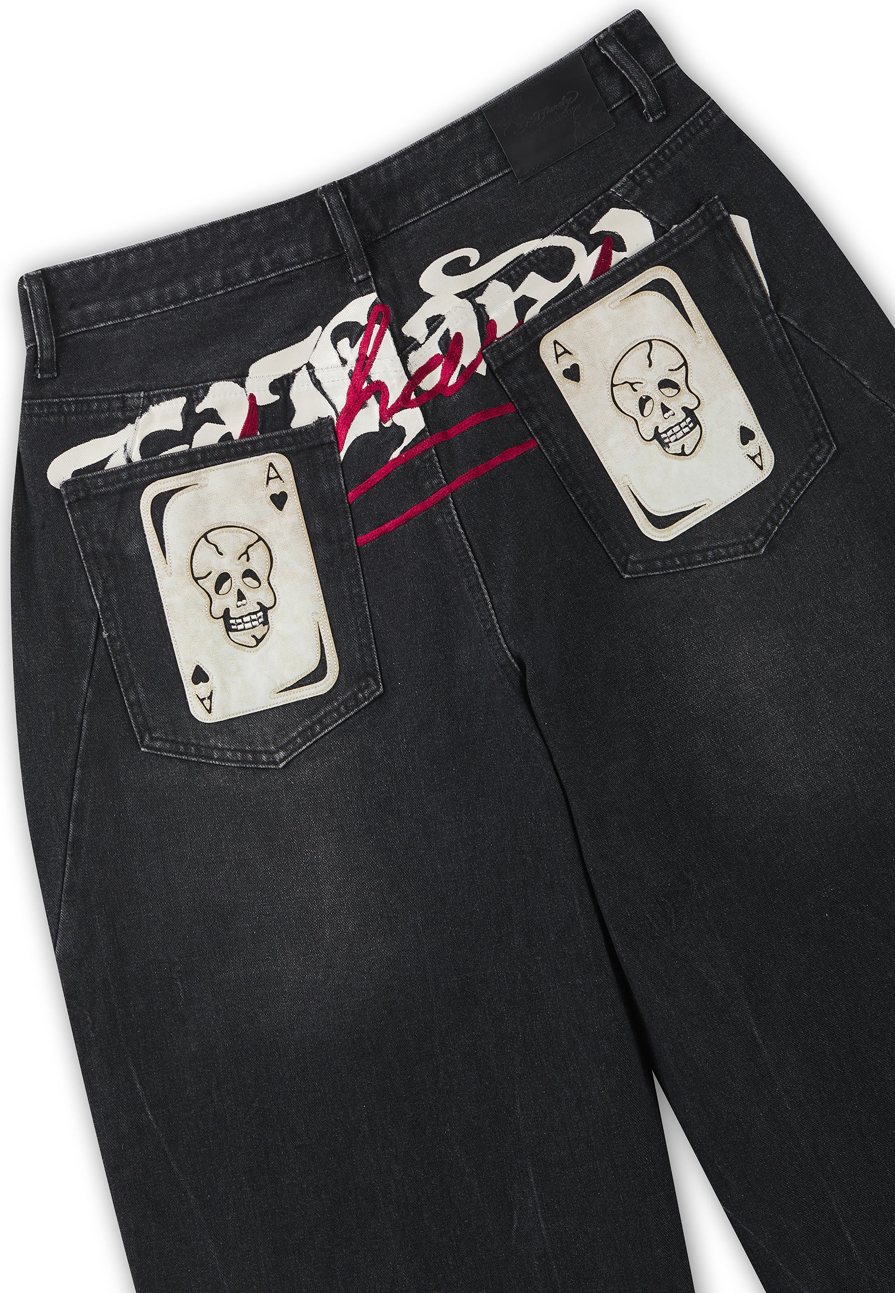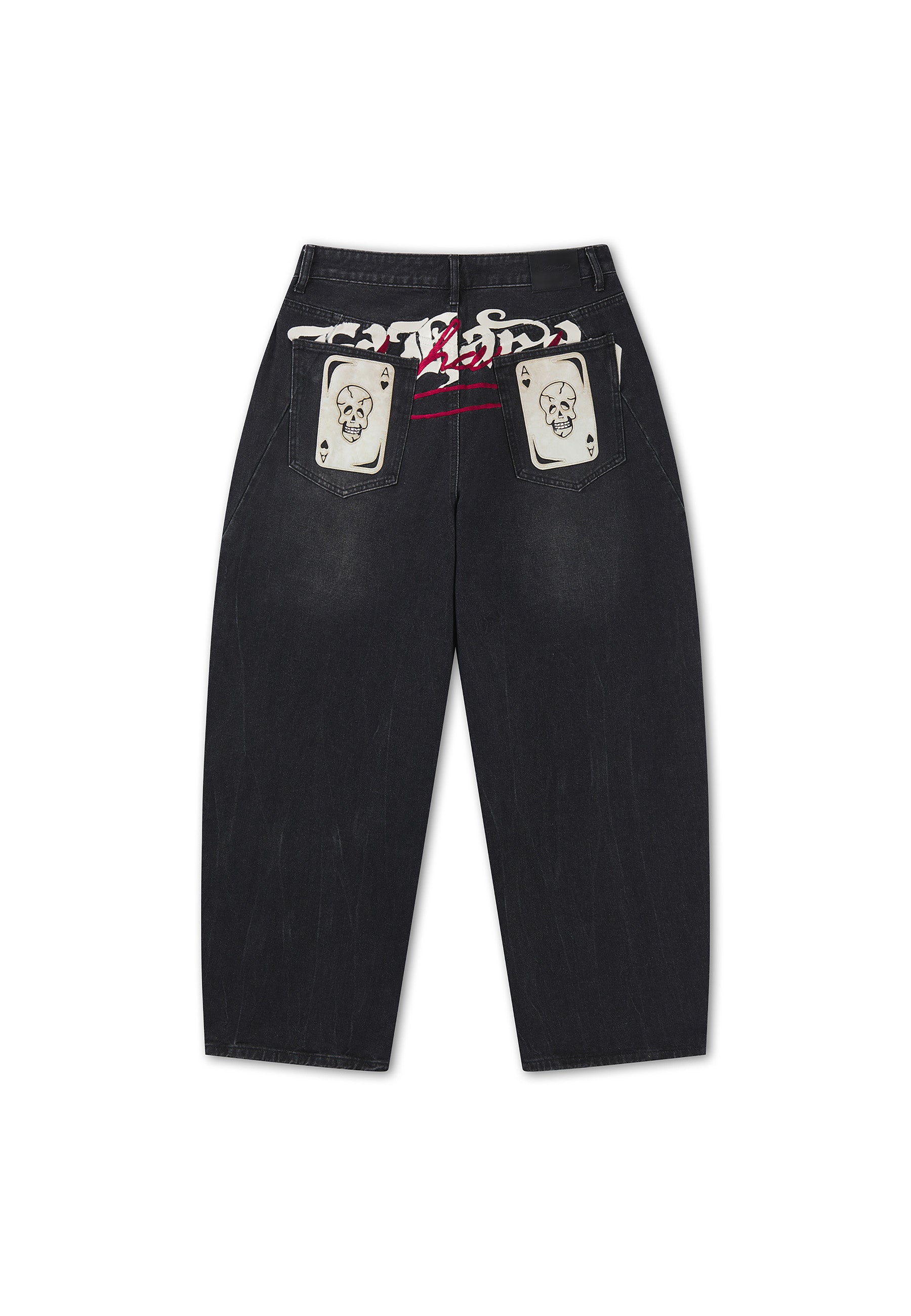 Mens Washed Skull Applique Barrel Leg Jeans - Black
