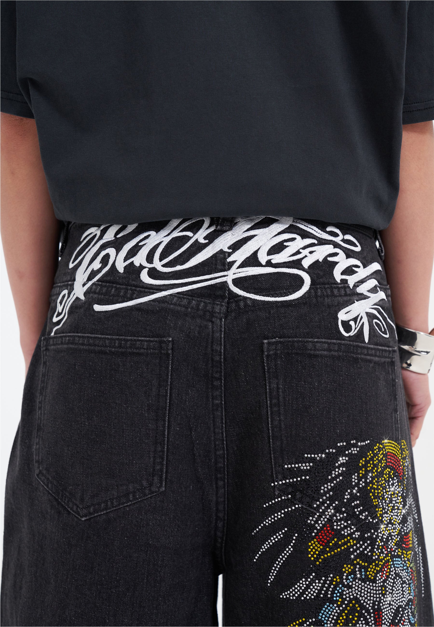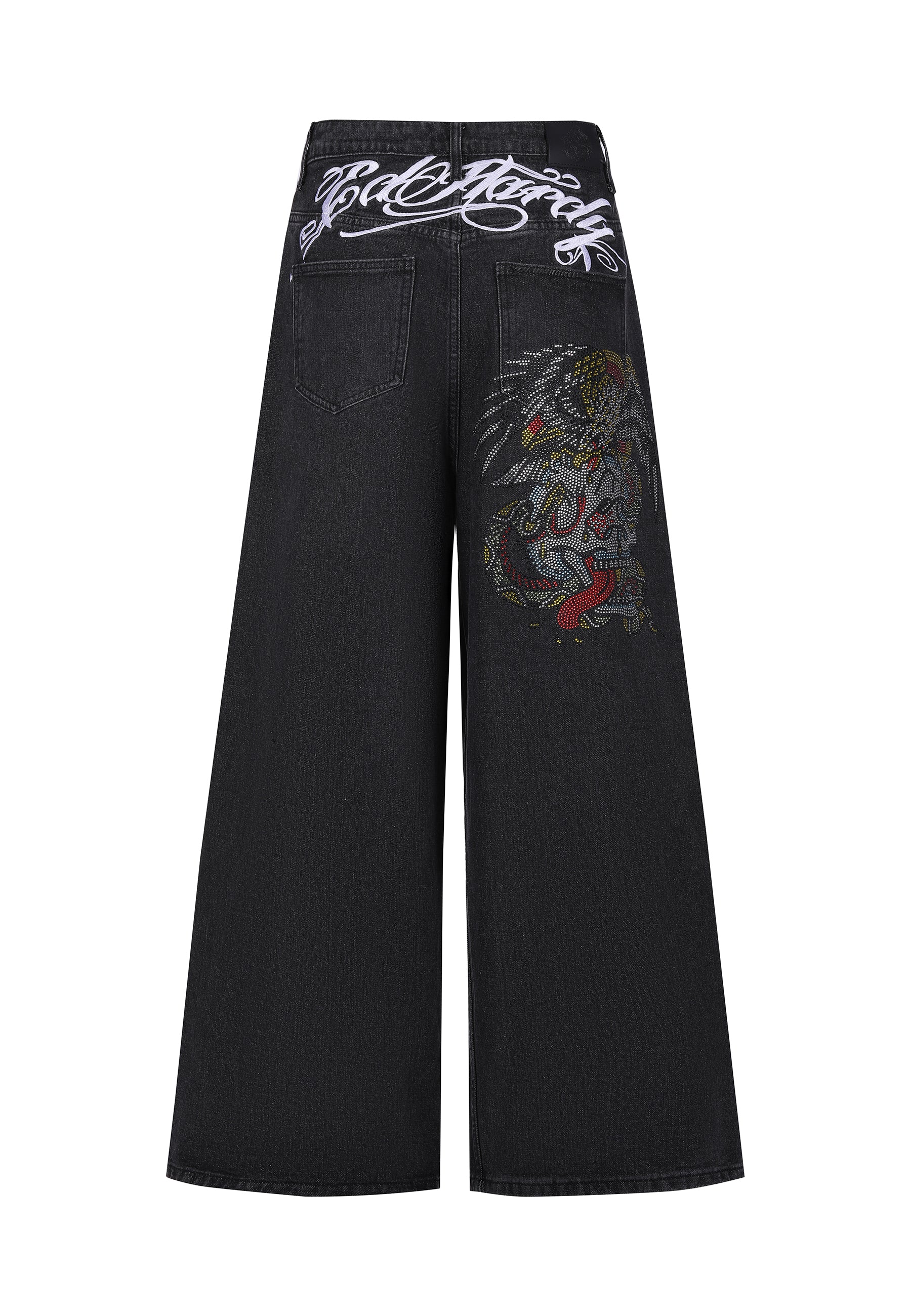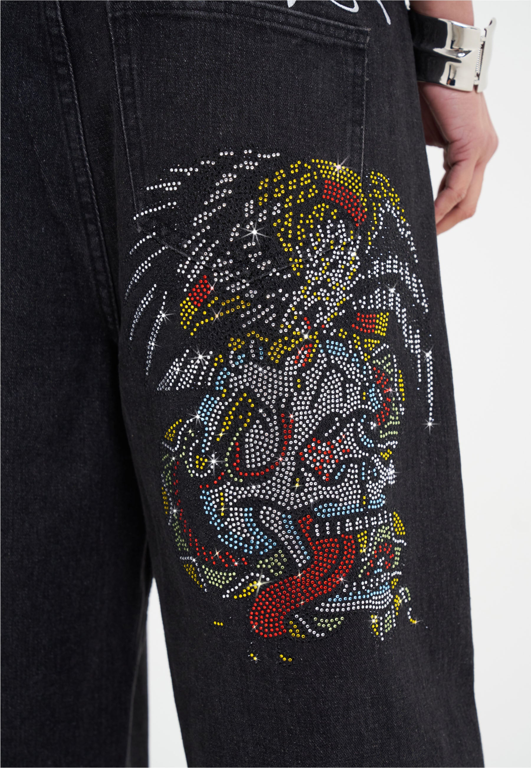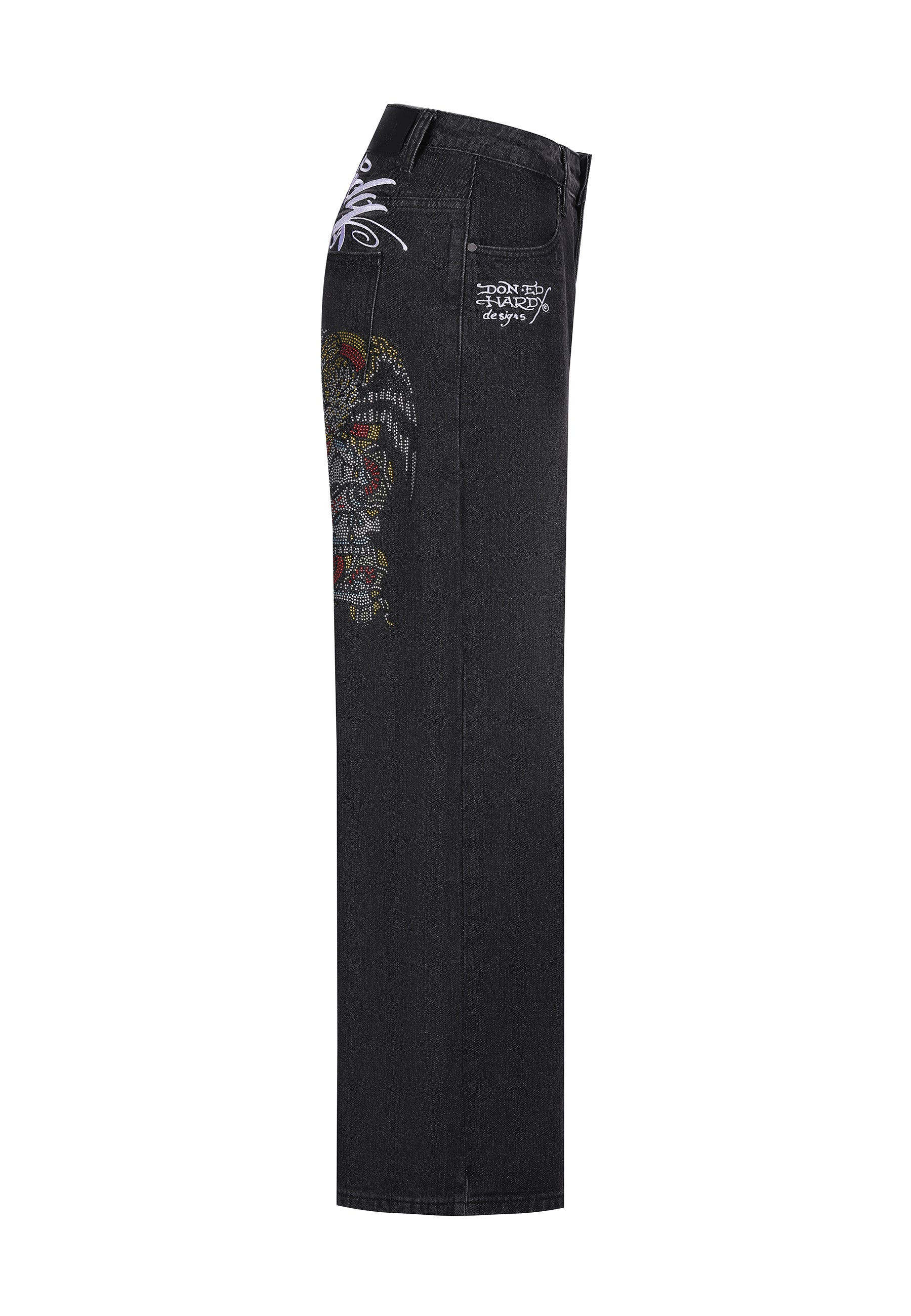Womens Eagle Skull Diamante Xtra Denim Trousers Jeans - Black
