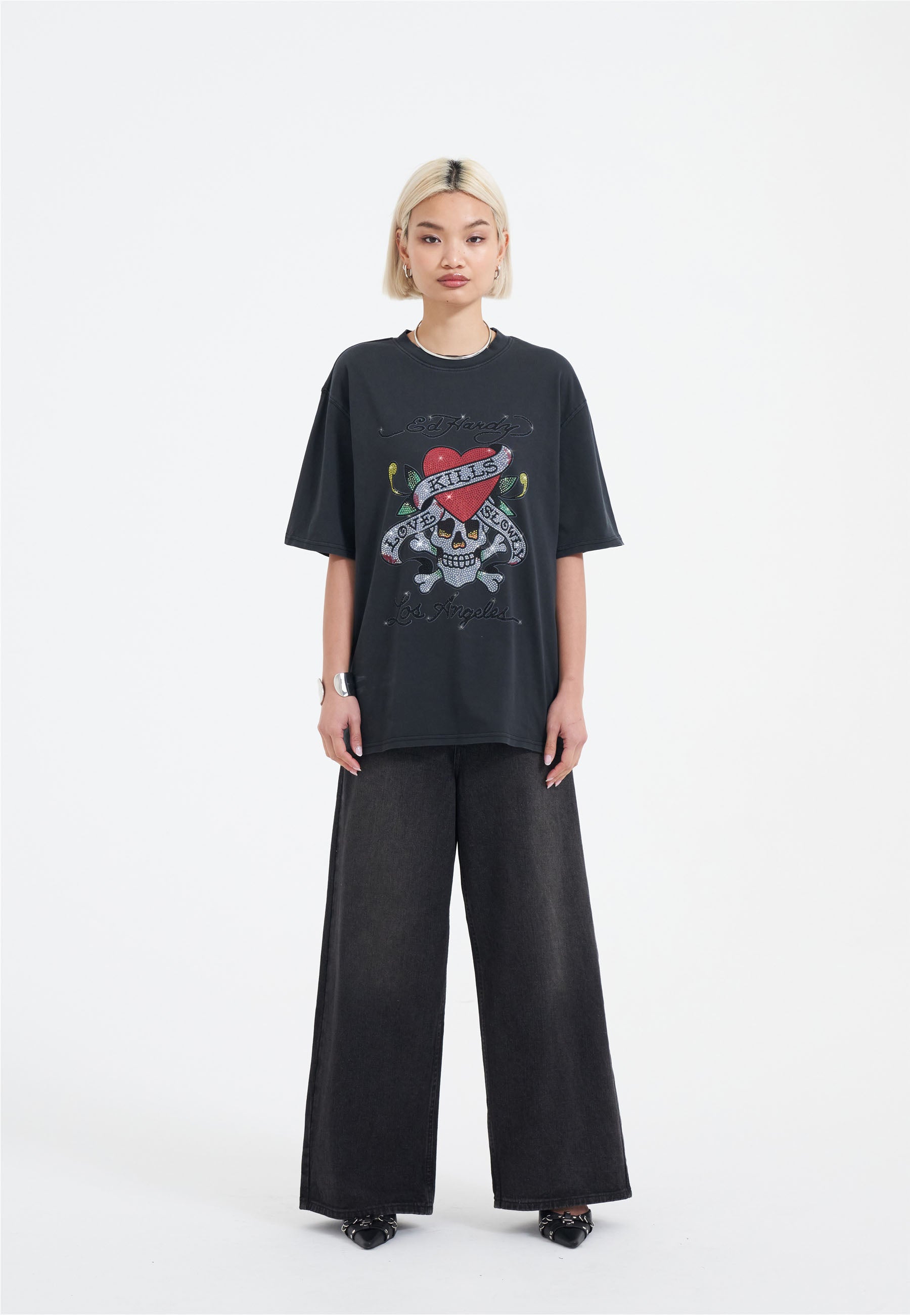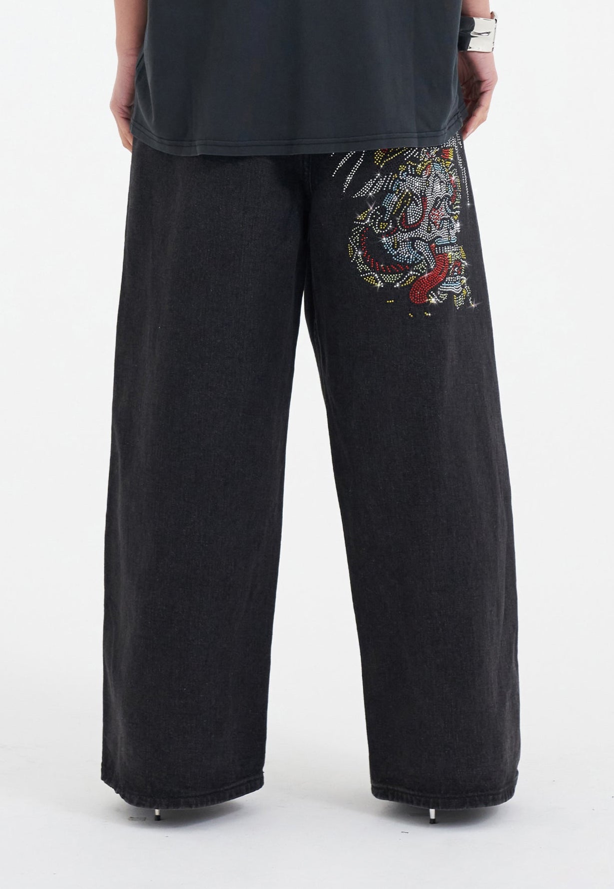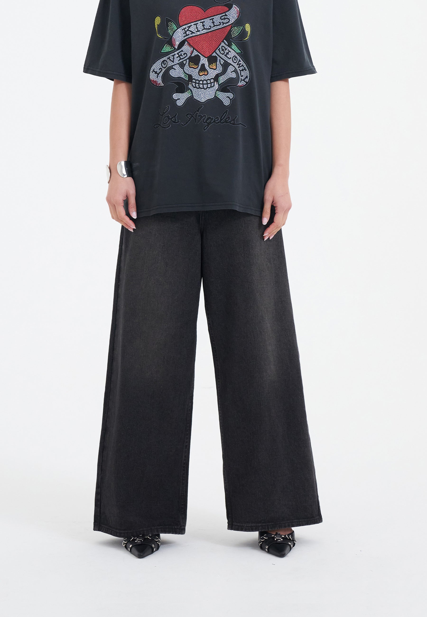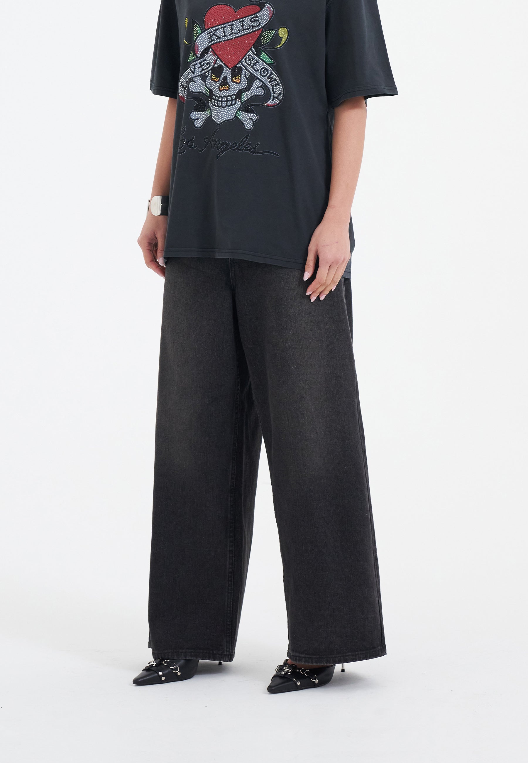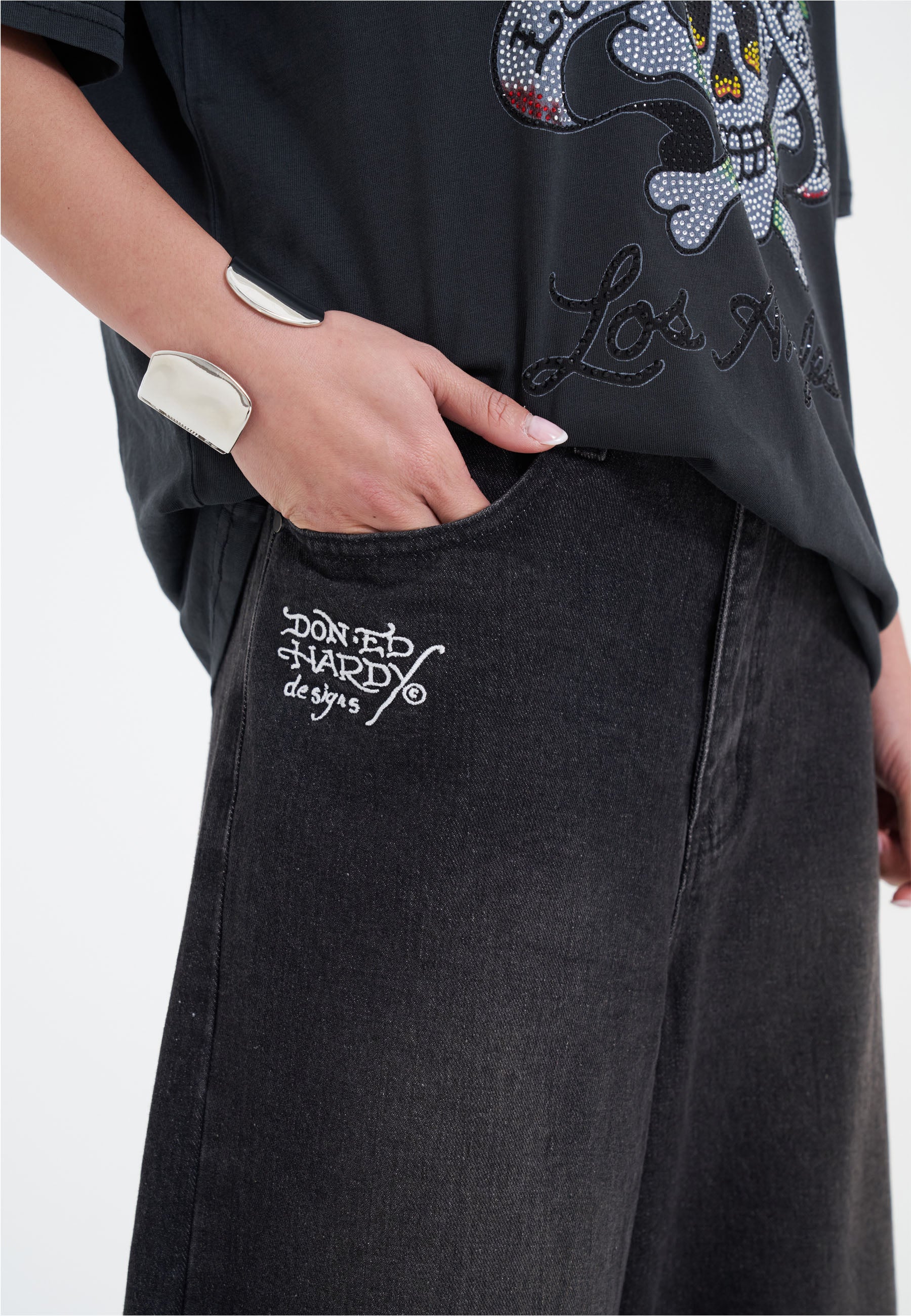 Womens Eagle Skull Diamante Xtra Denim Trousers Jeans - Black