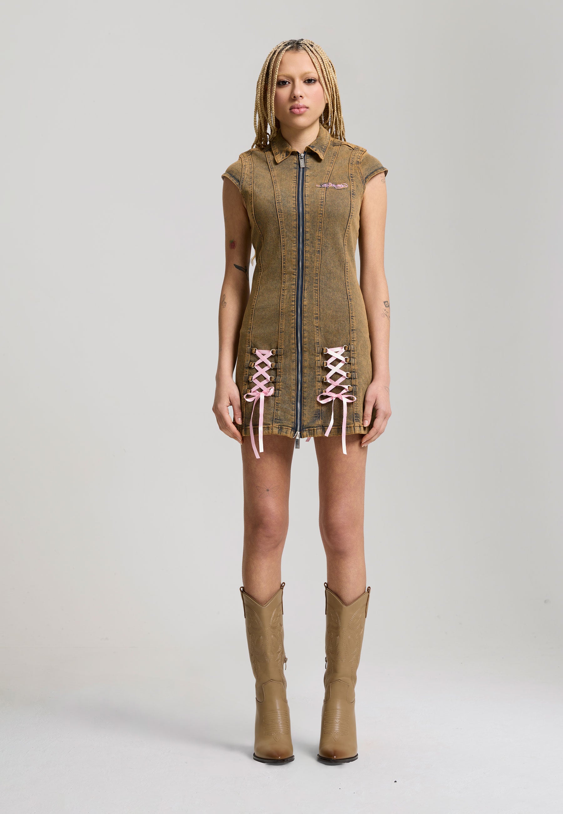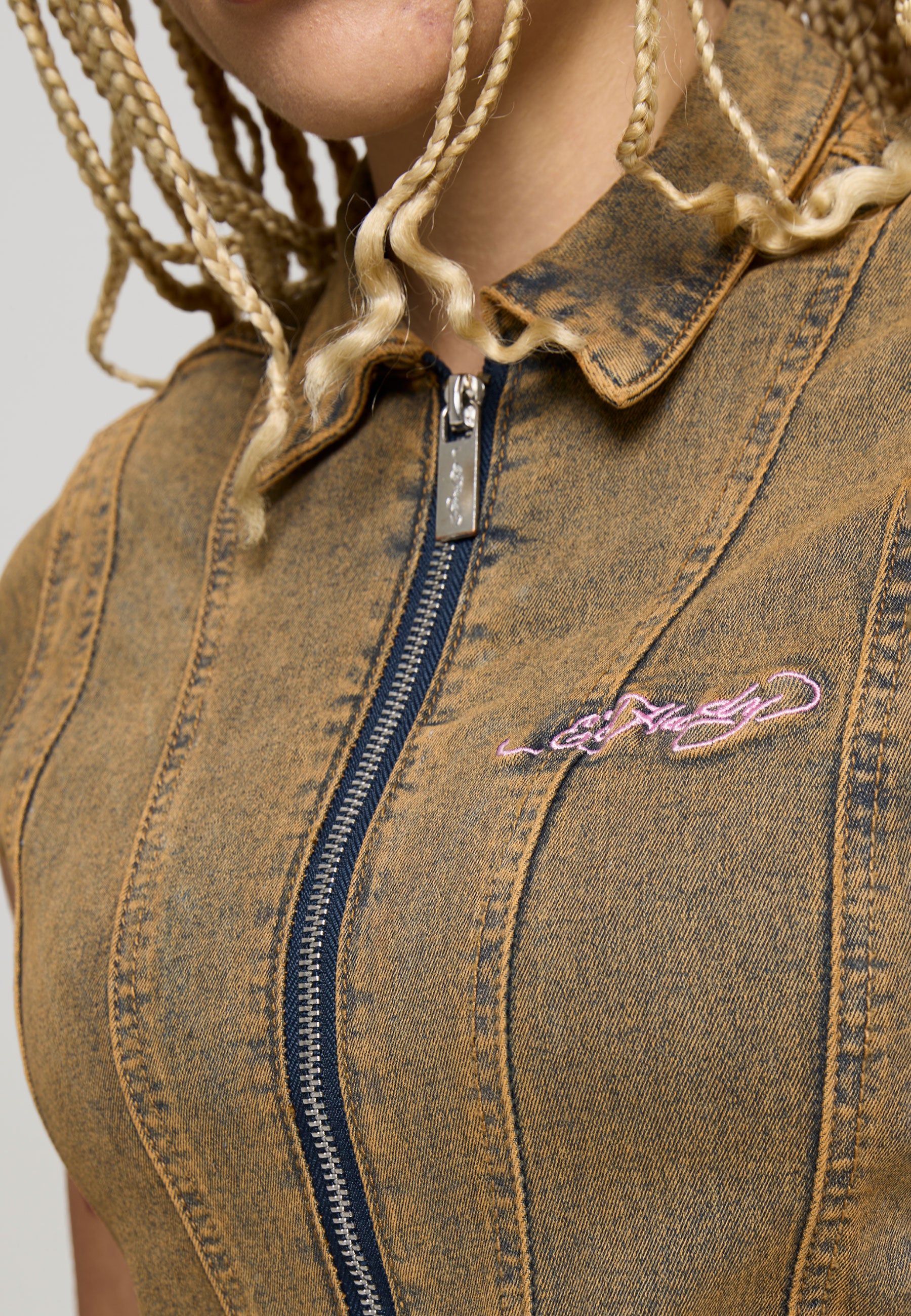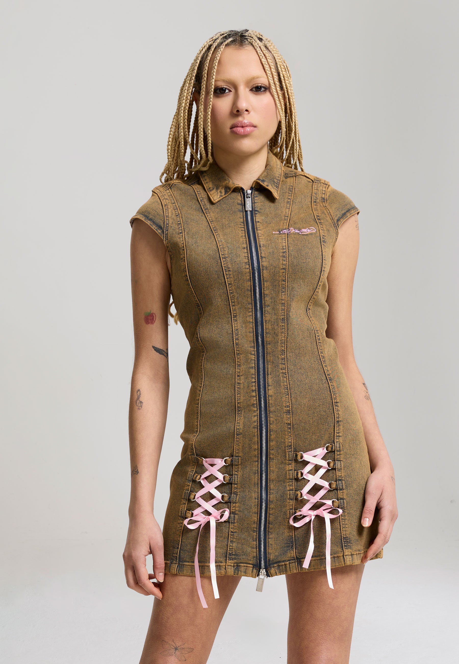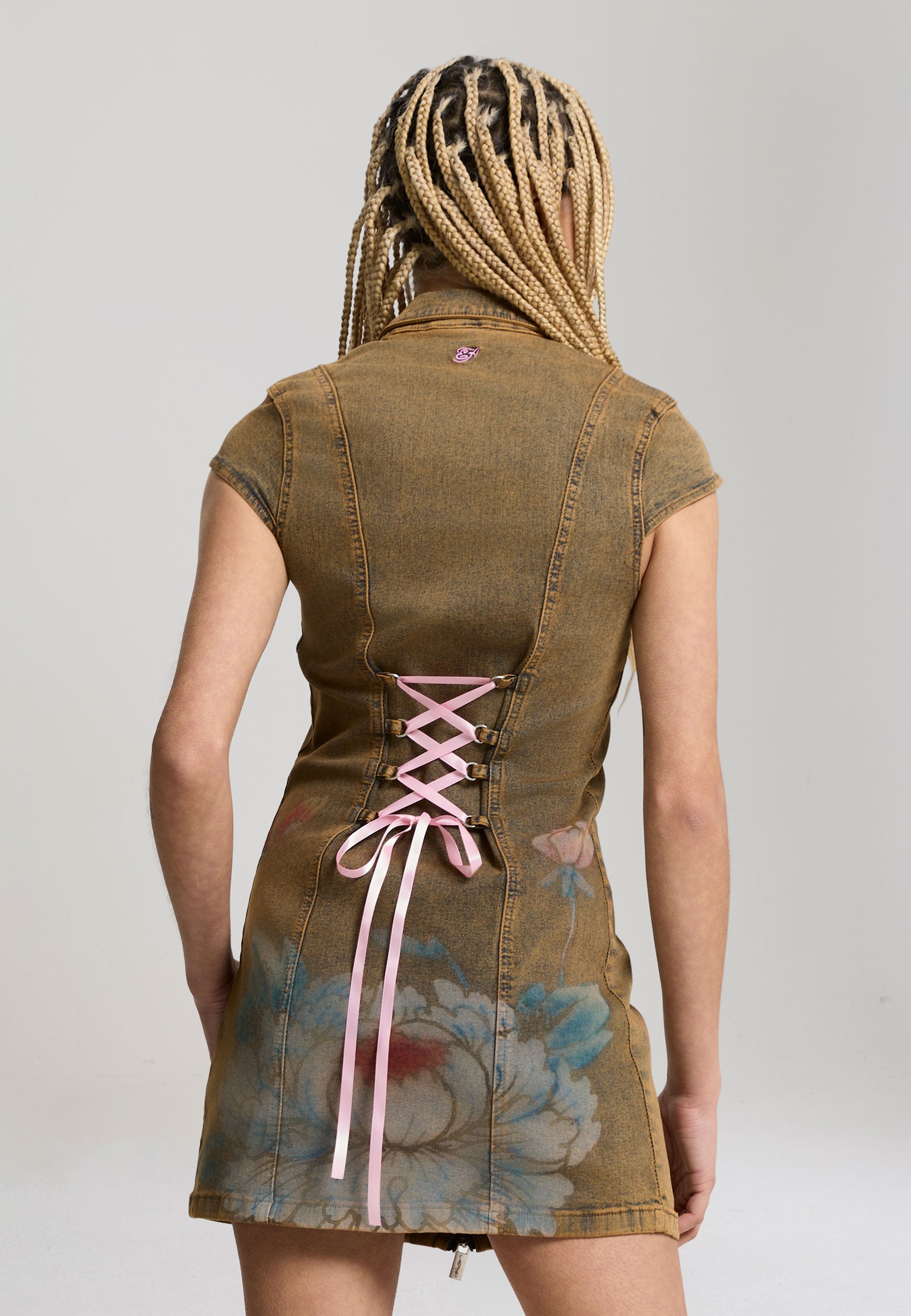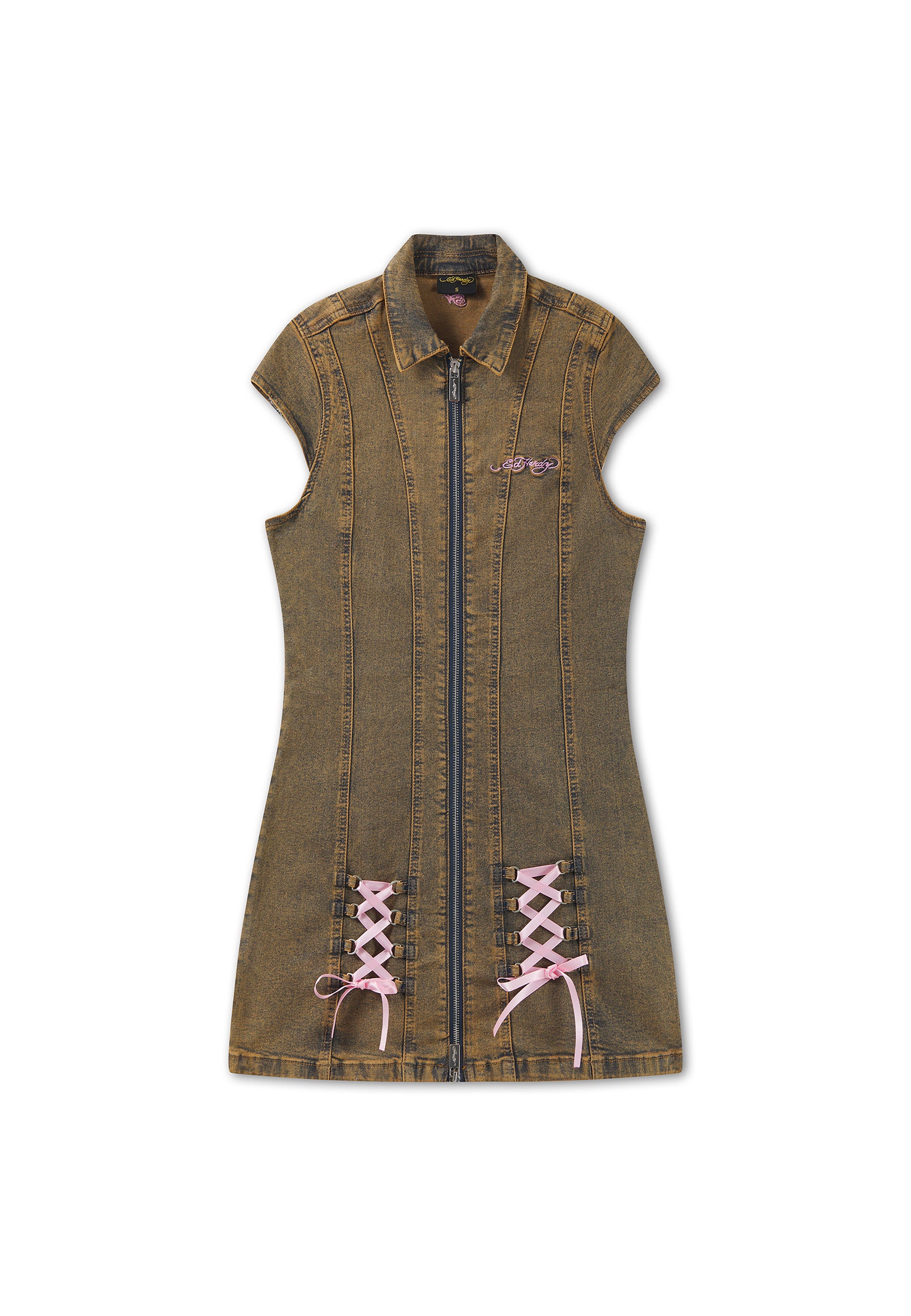 FITTED MINI LENGTH DIRTY OIL WASH 98% COTTON 2% ELASTANE ED HARDY SIGNATURE EMBROIDERY TO FRONT E.H LOGO EMBROIDERY TO BACK LOTUS FLOWER FADED GRAPHIC PRINT TO BACK CAP SLEEVE SEAM DETAILING RIBBON TIE UP DETAILING DOUBLE METAL ZIP TO FRONT REVERE COLLAR