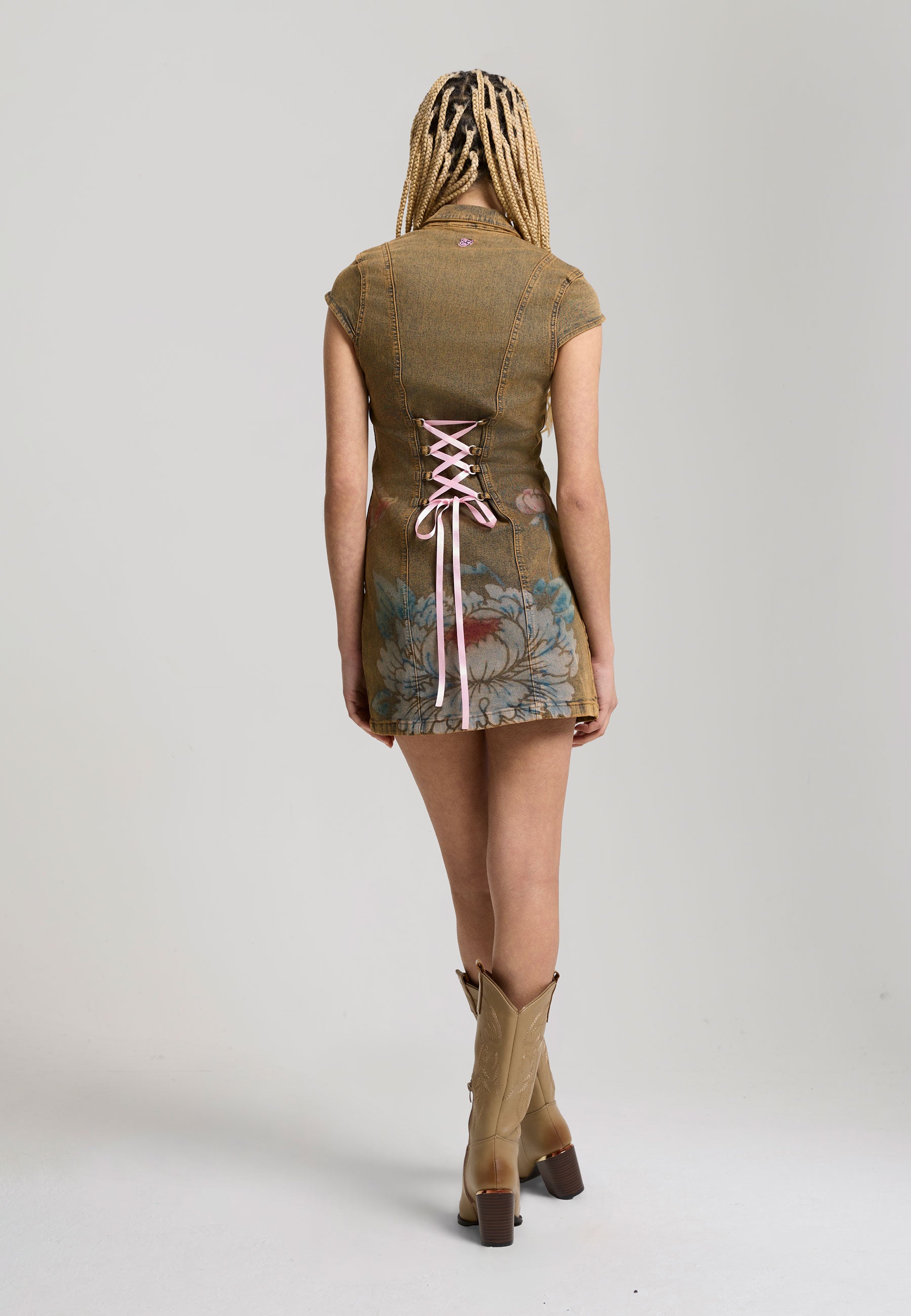 Womens Lotus Flower Seam Detail Tie Up Denim Dress - Beige