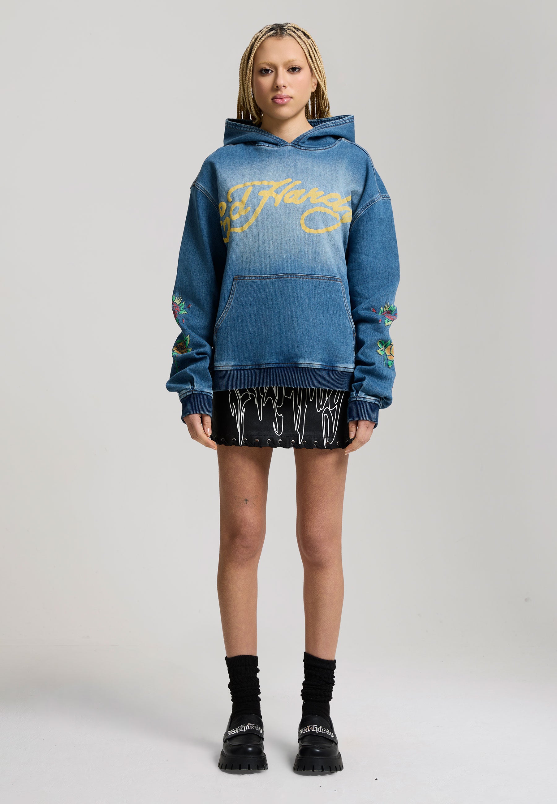 RELAXED FIT VINTAGE BLEACH WASH 63% COTTON 16% POLYESTER 1% ELASTANE ED HARDY SIGNATURE PRINT TO FRONT FLORAL PRINT TO BOTH SLEEVES BACK GRAPHIC IN PRINT LONG SLEEVE KANGAROO POCKET 3 PANEL HOOD